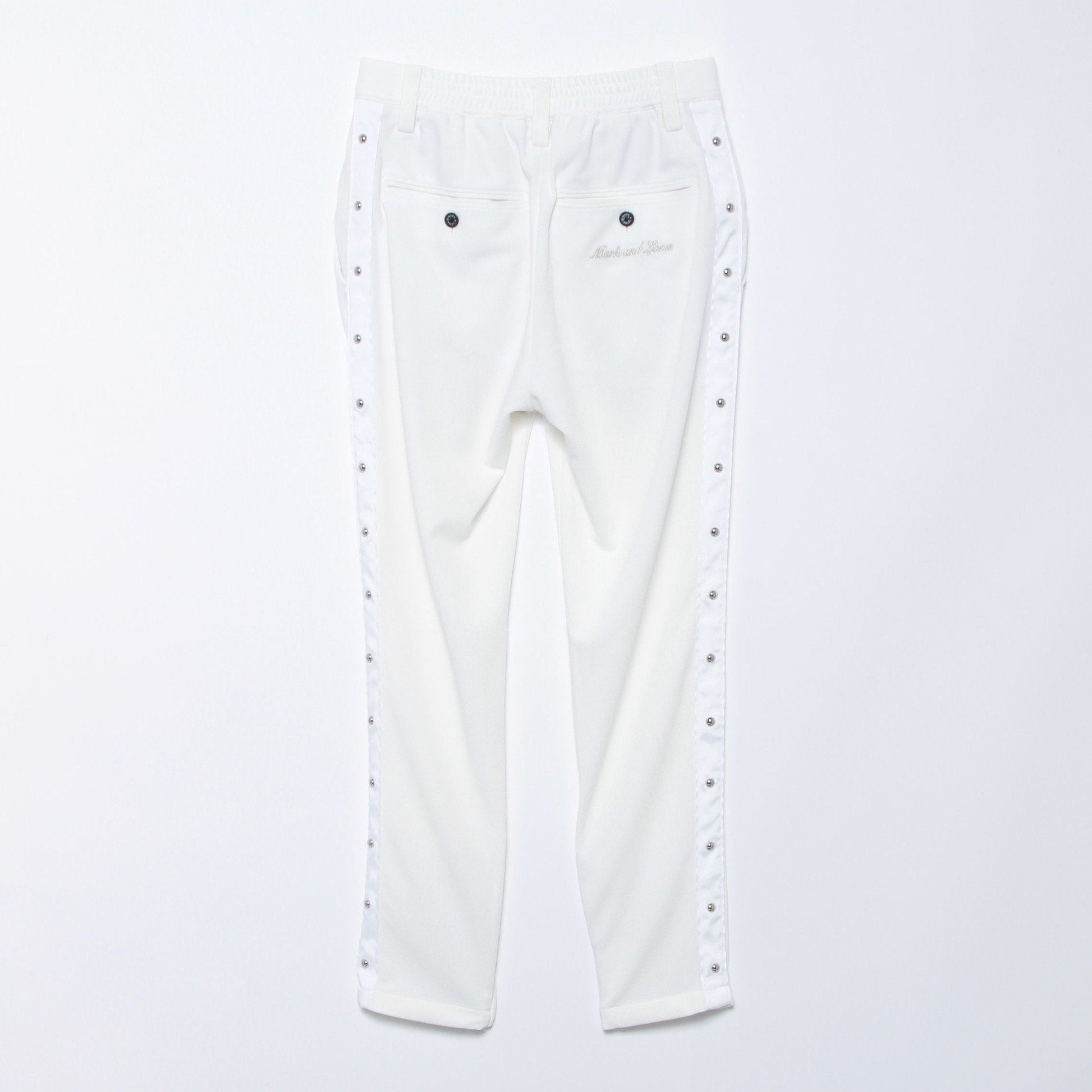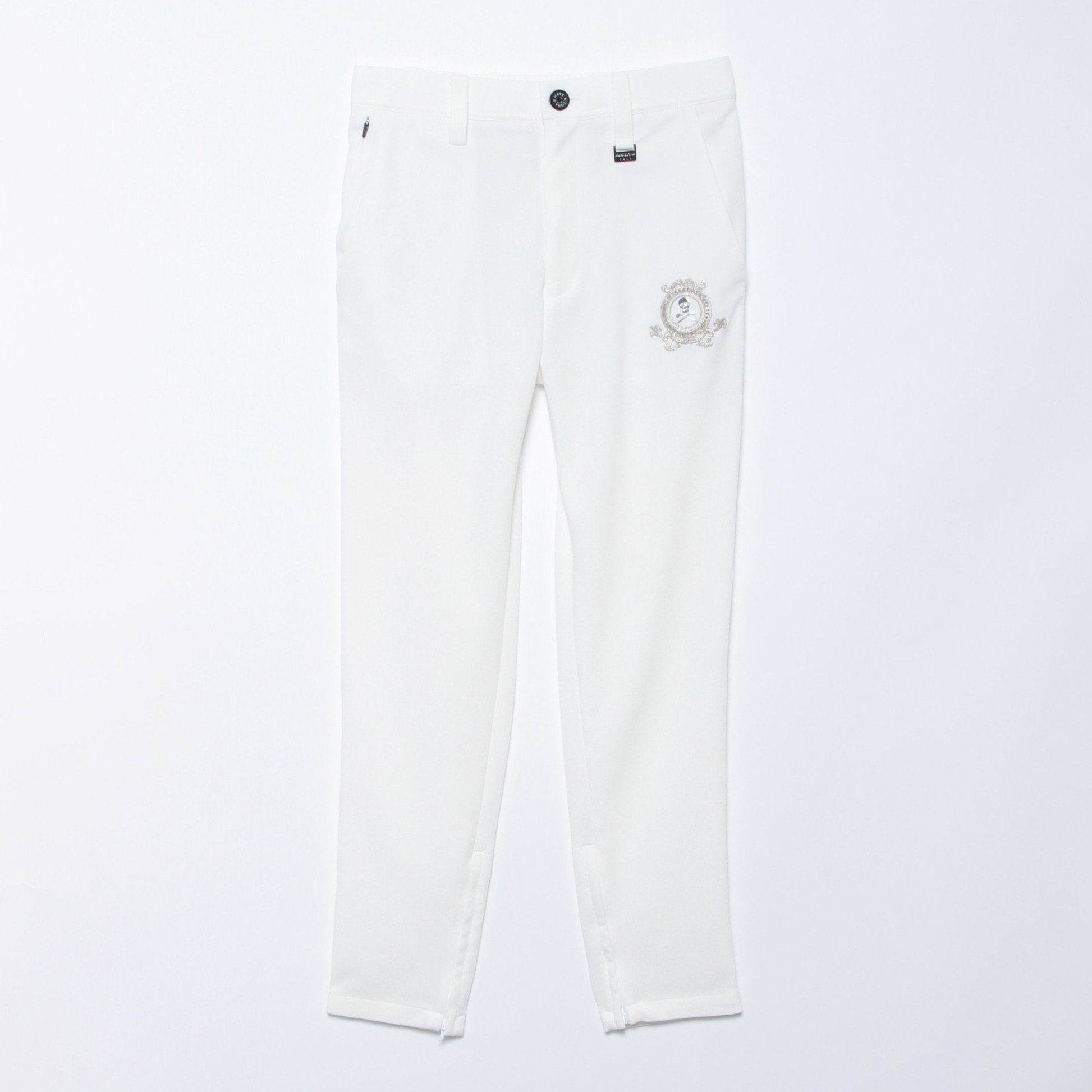 2023 SPRING | SUMMER COLLECTIONリッチな輝きを放つラウンドスタッズと、メタリックなワッペンがキラリと光るラグジュアリーなトラウザーパンツ。左モモにクラウンをモチーフにしたメタリック刺繍ワッペンとアイアンスカルのメタリックプリント、ベルトループにロゴ刻印入りのミニチャーム、右ヒップに筆記体ロゴのメタリック刺繍をあしらいました。ヒップやモモまわりにゆとりをもたせつつ、裾に向かってスリムになるスタイリッシュなテーパードシルエットを採用。裾はシャープな印象になるよう細めに設定しつつ