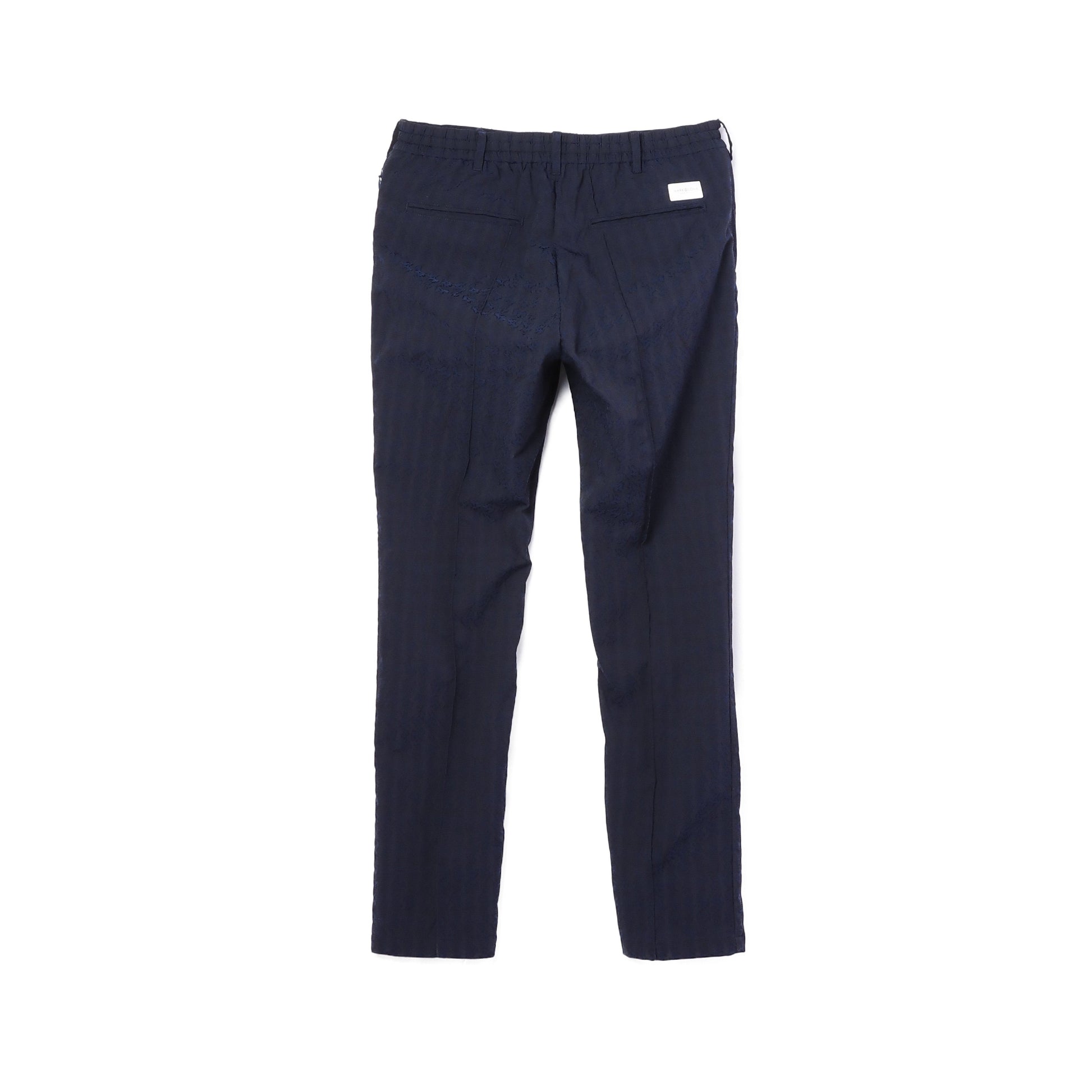 フロントはジップフライ仕様、トップボタンはスナップボタン仕様。フロントポケットは実用性に優れたスラッシュポケット。バックポケットは両玉縁ポケットとなります。着用した際のシルエットは膝下から裾にかけてゆるやかに絞りを入れた細身のテーパードシルエットに仕上がっています。単品での着用は勿論、セットアップでカジュアルスーツとして、幅広いTPOで着用可能なアイテムです。超軽量で持ち運びに便利です。