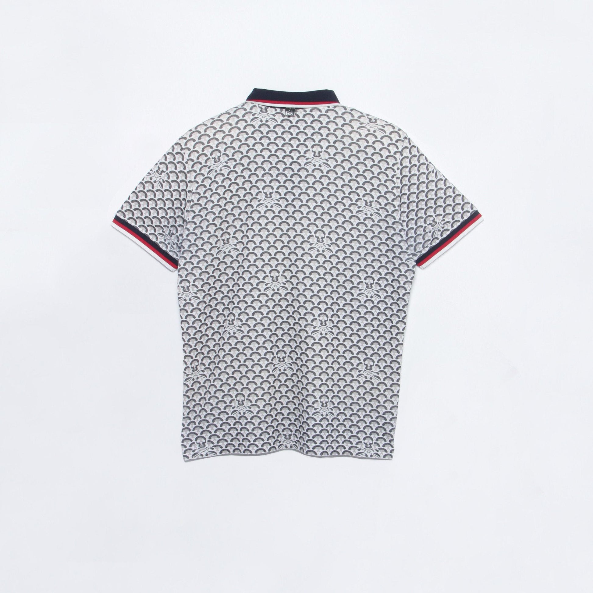 レトロ感漂う、スカルが連続したスケール柄の半袖ポロ。プラケットのロゴ入りスナップボタン、左胸に角度によって色が変わって見えるオーロラサークルスカルワッペン、衿後ろにスカルピスネームを配しました。上品なシルエットながら身幅にややゆとりをもたせているので、楽なスイングが可能です。表面にはコットン素材、裏面にドライタッチのポリエステル糸を使用。コットン素材に見えながらも即乾性(DRY FAST加工)と軽量化を実現したオリジナル素材です。
