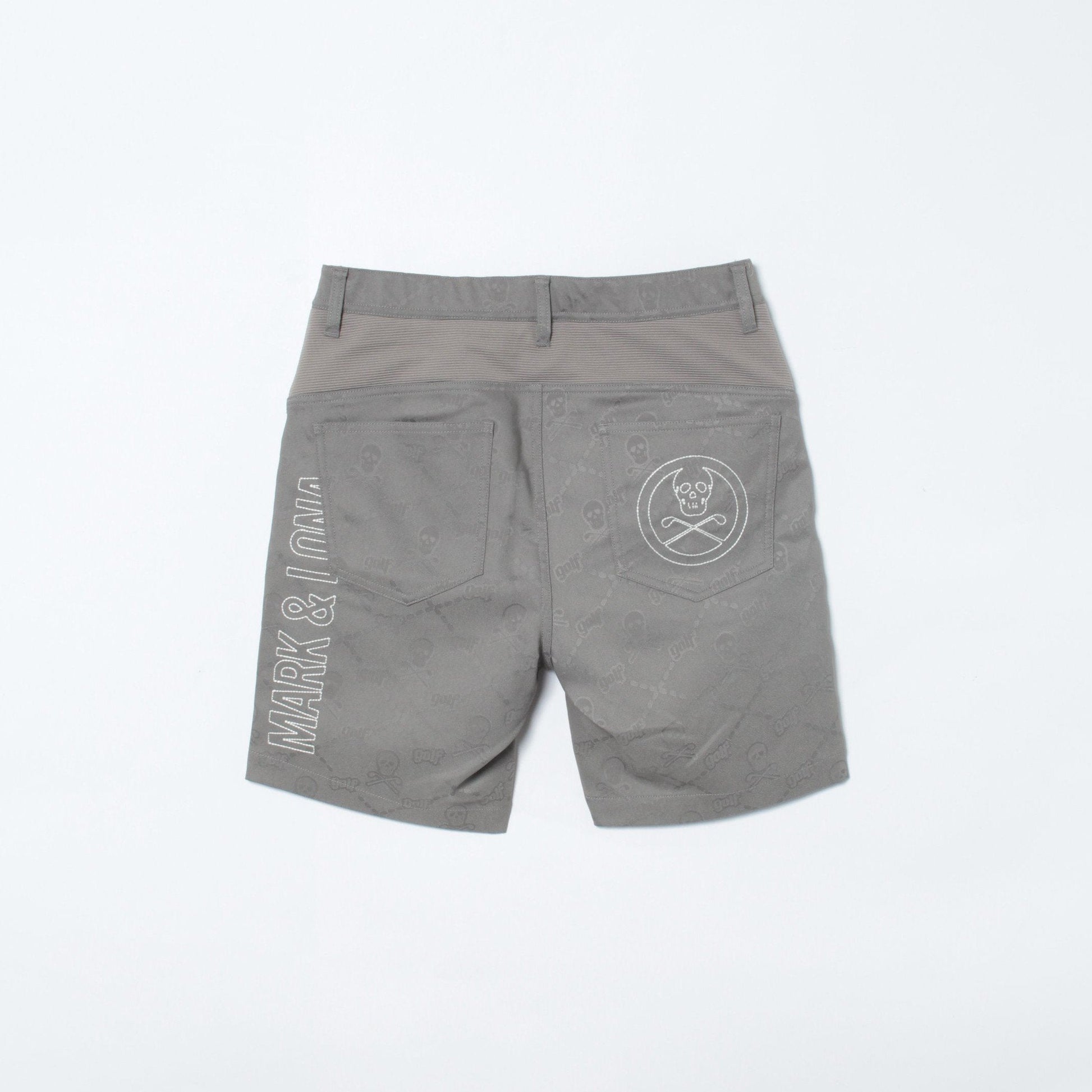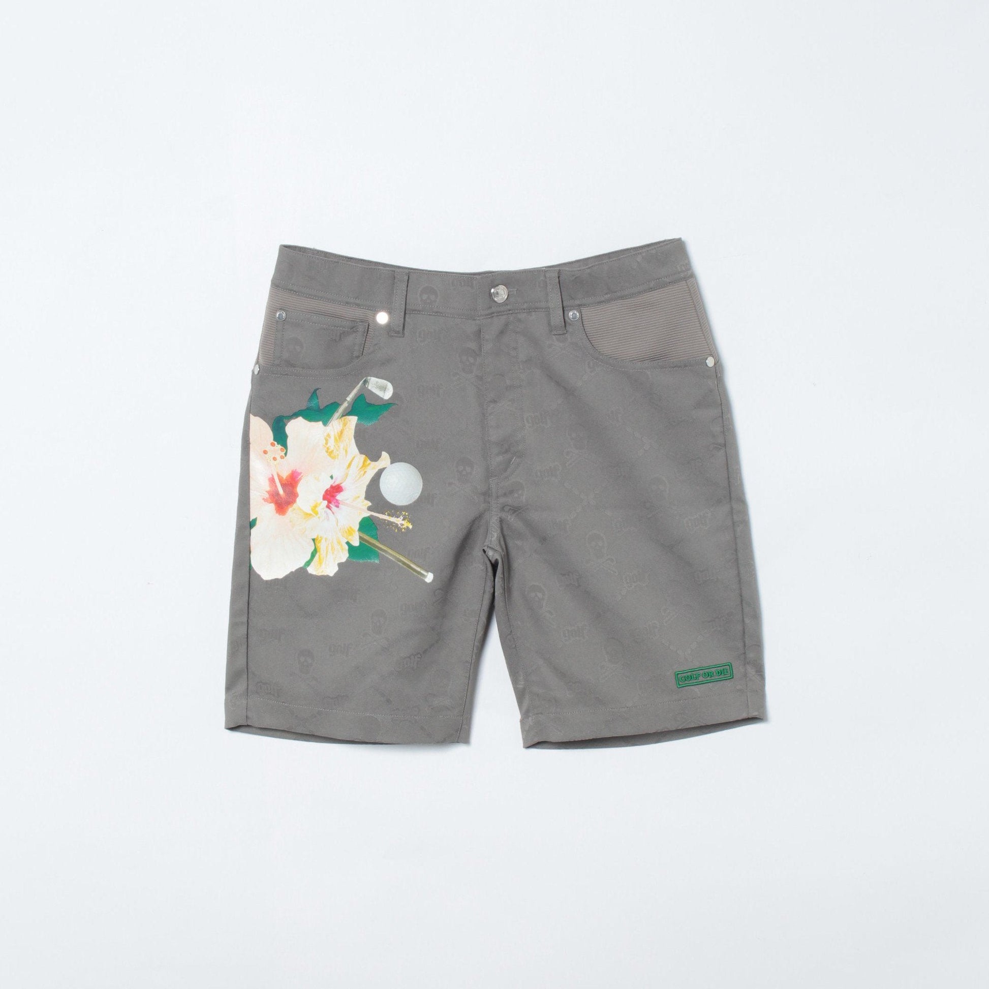ハイビスカスモチーフを大胆にプリントした、クラシカルなキルトパターンストレッチジャカード素材の5PKショーツ。フロントにロゴが刻印されたタックボタン、ポケット口にロゴが刻印されたリベット、右後ろポケットにステッチ風サークルスカル刺繍、左前裾に"GOLF OR DIE"ロゴの立体刺繍、左脇にステッチ風ブランドロゴ刺繍、帯の前端にジャカードでロゴを表現したピスネームをあしらうなど、ディテールにもこだわりを忍ばせました。右もものハイビスカスデザインは、生地の風合いやストレッチ性を損なわない特殊インクジェットプリントで表現しています。