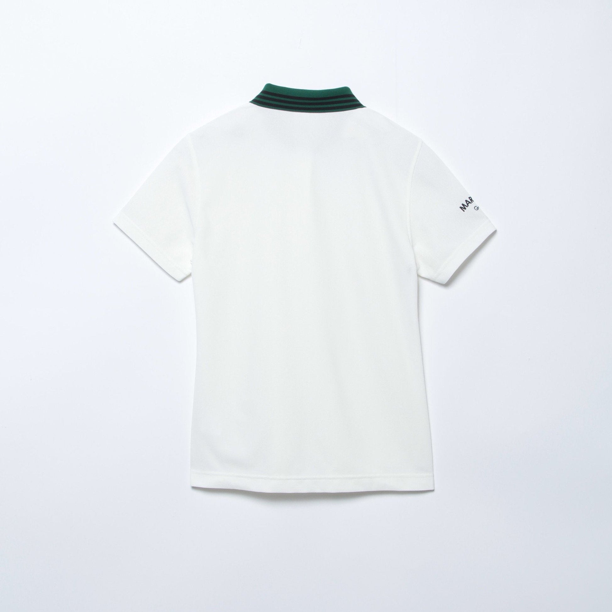 ペットボトルを原料とするリサイクルポリエステル糸を使ったハイゲージ裏鹿の子素材を採用。吸水性に長け、UVカット効果も備えています。襟はしっかりと編み上げられたスポーティなラインデザインで、襟を立てた際も美しいラインをキープ。前立ての裏側には同色のヘリンボンテープを装着。ボタンを外すとテープがチラリと見える、洒脱な着こなしがお楽しみいただけます。