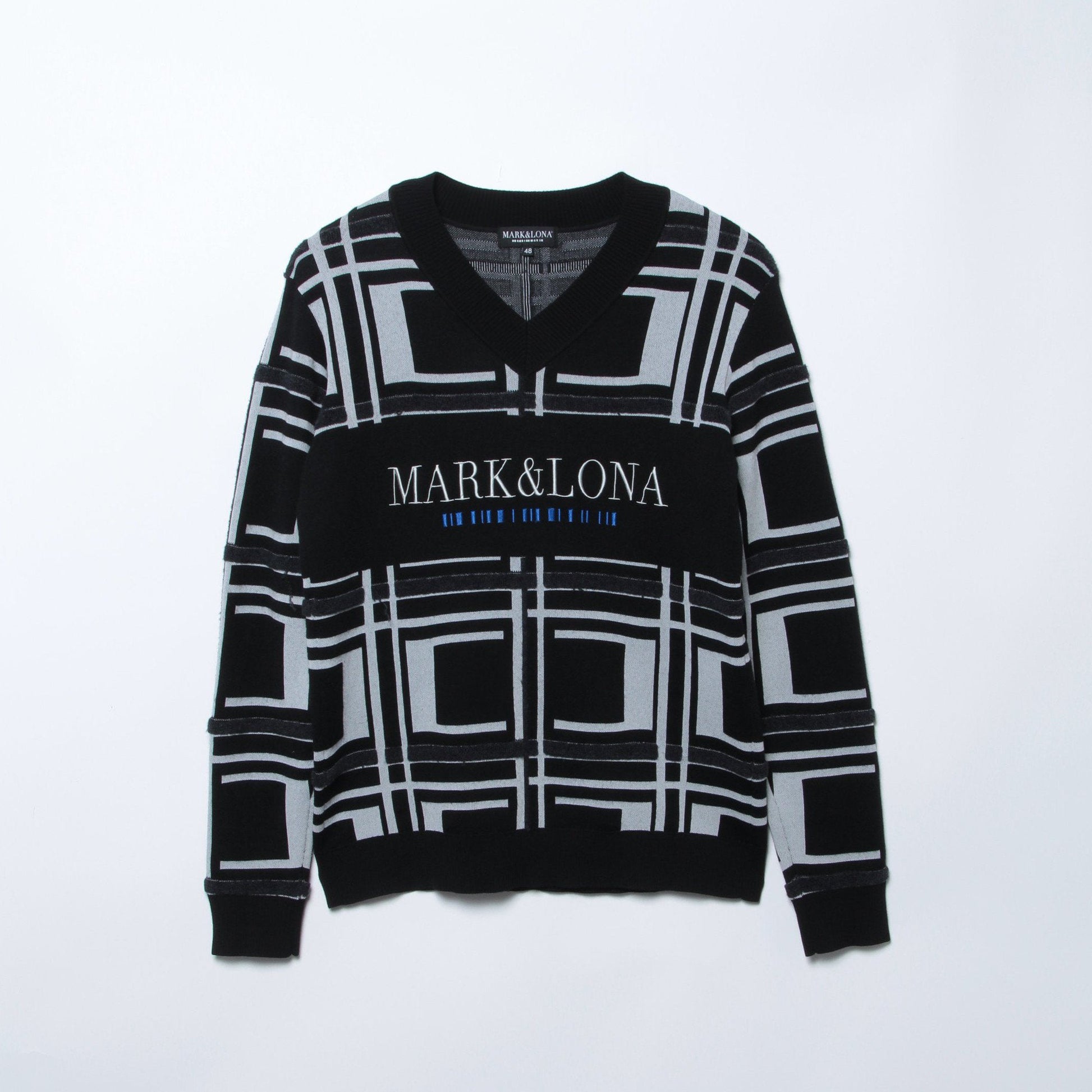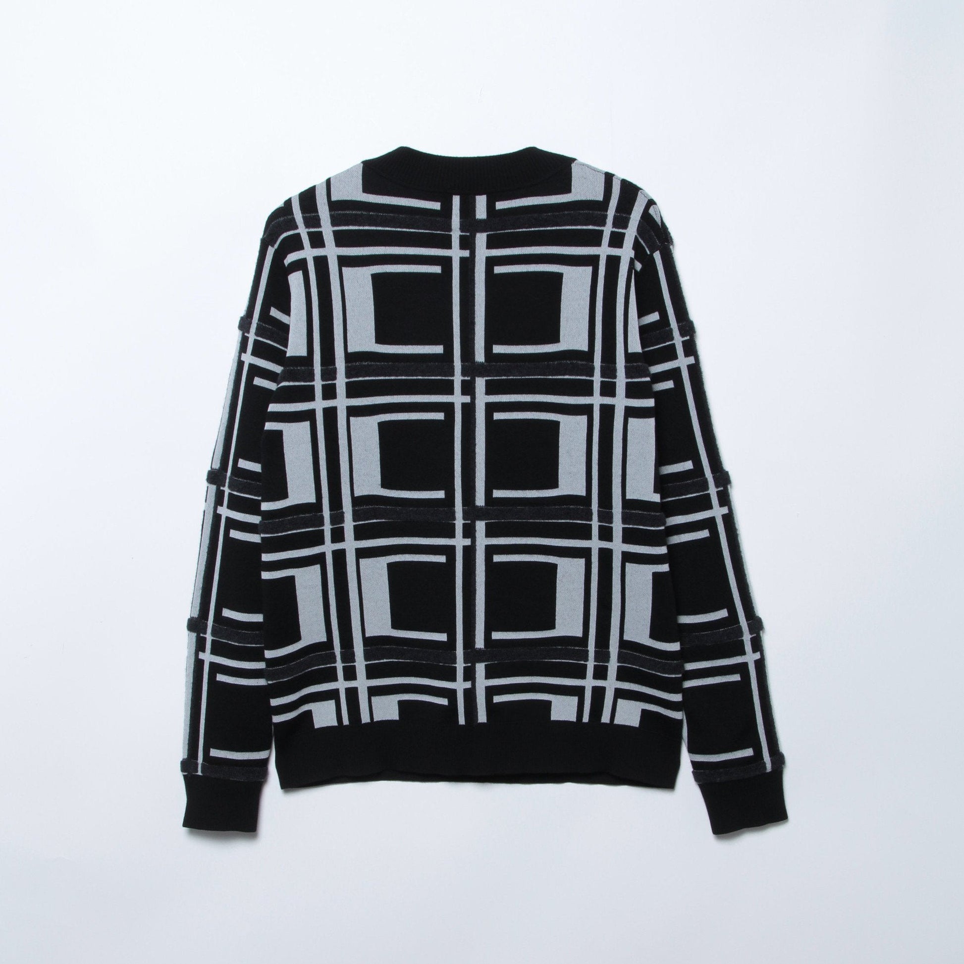 CODEの「C」をモチーフにした特殊なジャカード組織を用いたVネックニット。凹凸のあるデザインで、チェック柄が際立っています。フロントにはCODEのシグネチャーロゴが立体刺繍で施され、独自性を引き立てています。シルエットには上品さがありつつも、快適な着心地を提供するために、身幅に少しゆとりを持たせています。またネックは浅く設定され、クラシカルな雰囲気が漂います。