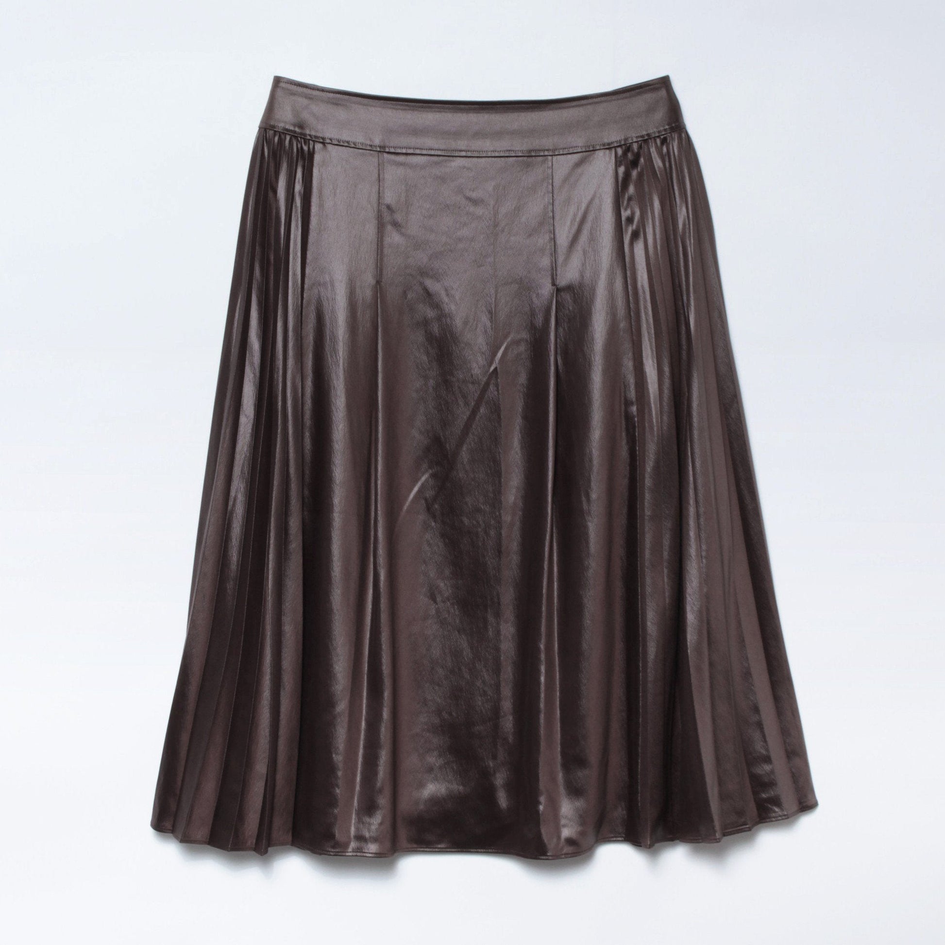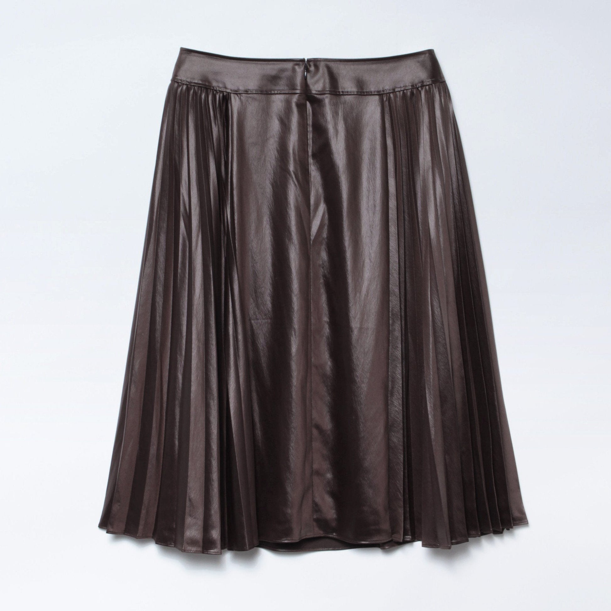 旬なムードたっぷりのレザーライクサテンのスカート。レザーのようなリュクス感がありながら、ソフトな風合いで軽やかに穿きこなせるアイテムです。プリーツをサイドのみに入れて、裾の広がりを部分的に抑えたデザインもポイント。すっきりした印象をキープしつつ、歩いた時に美しい揺れ感を楽しめます。
