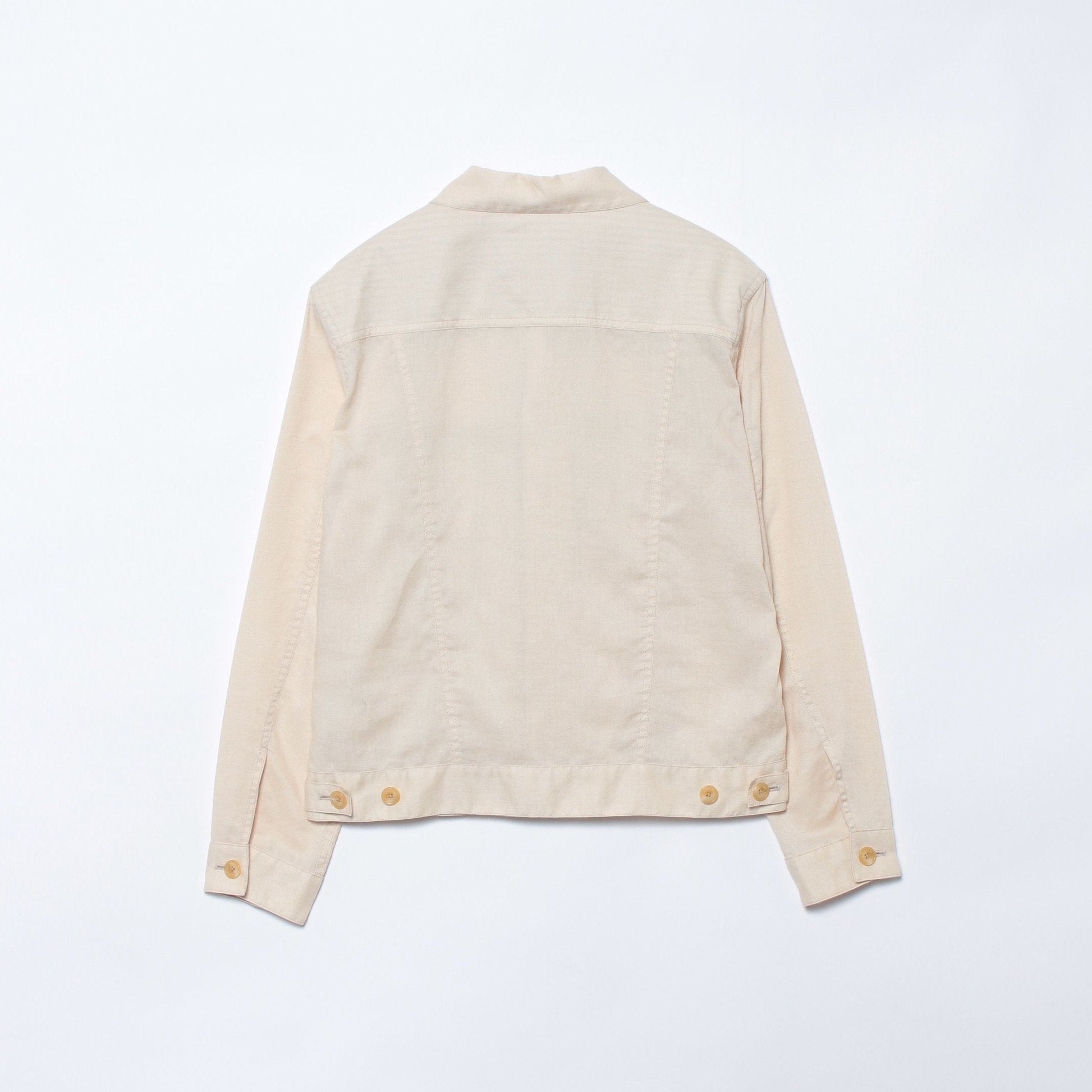 身頃にポケットを付けたラフな印象のデザイン。ナチュラルな色合いでコーディネートに取り入れやすく、春先に1着持っていると羽織として活躍します。