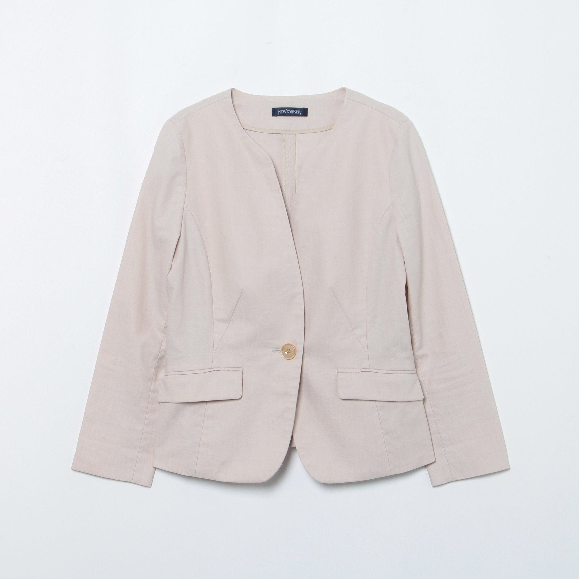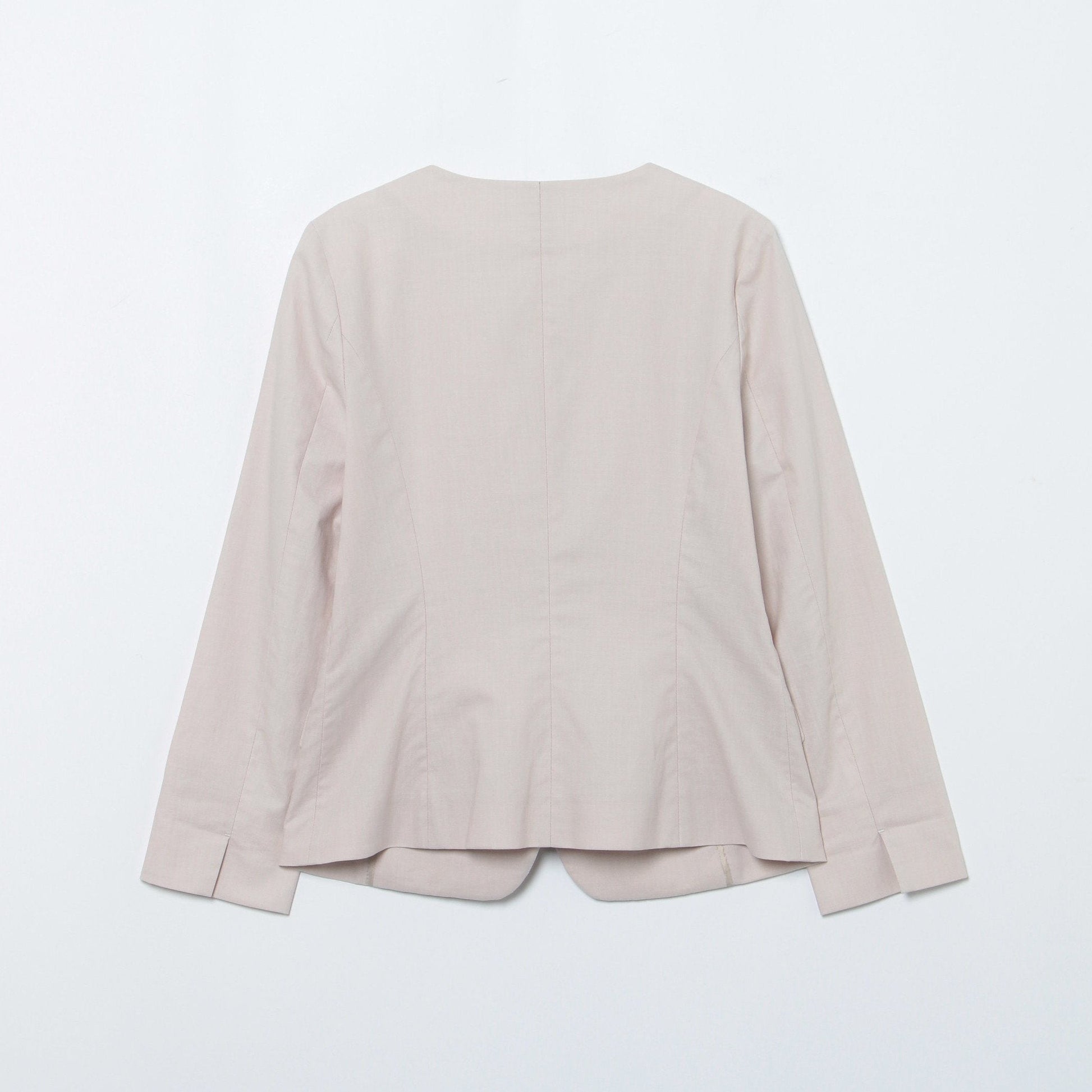 クルーネックとVネックが融合したような、女性らしさとシャープな魅力を兼ね備えたカーヴィーなネックラインがポイント。1つボタン仕様のすっきりとしたシルエットで、スタイリッシュな着こなしへと導きます。裏地なしの一枚仕立てや、手首がのぞく九分袖で程よく軽さを出しているのもポイント。袖口はスリット入りで折り返したスタイリングも可能です。