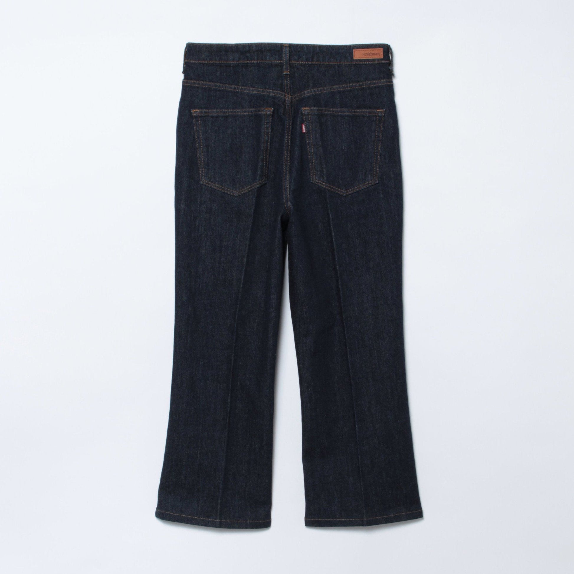 脚が長くすっきりと見えるシルエットにこだわり、裾にかけて少しフレアを入れました。一般的なブーツカットとは違い、裾幅を極端にとらずストレートに近いデザインです。折山プレスを入れて大人っぽく仕上げました。股上は深め、ヒップにかけて丸みのあるパターンで穿き心地の良い設計です。