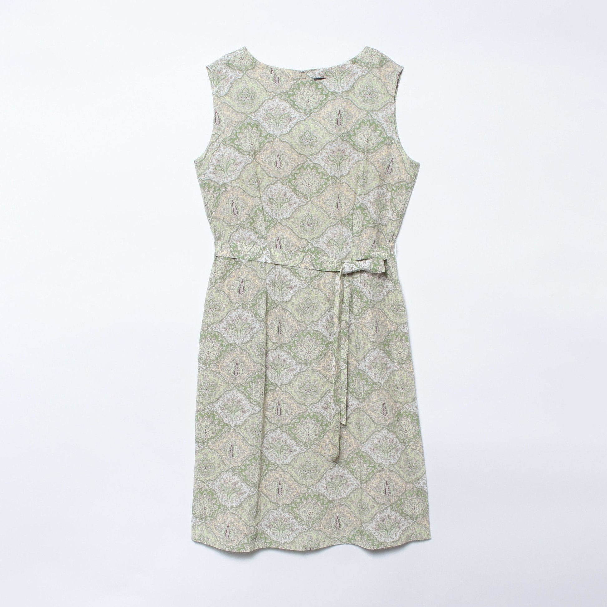 バンダナプリントの爽やかなノースリーブワンピース。程よく落ち着いた印象も感じられるカラーリングが心地よいサマーアイテム。フラットシューズを合わせて旅行に、ジャケットやパンプスを合わせて華やかなイベントにと、幅広いシーンでお楽しみになれます。