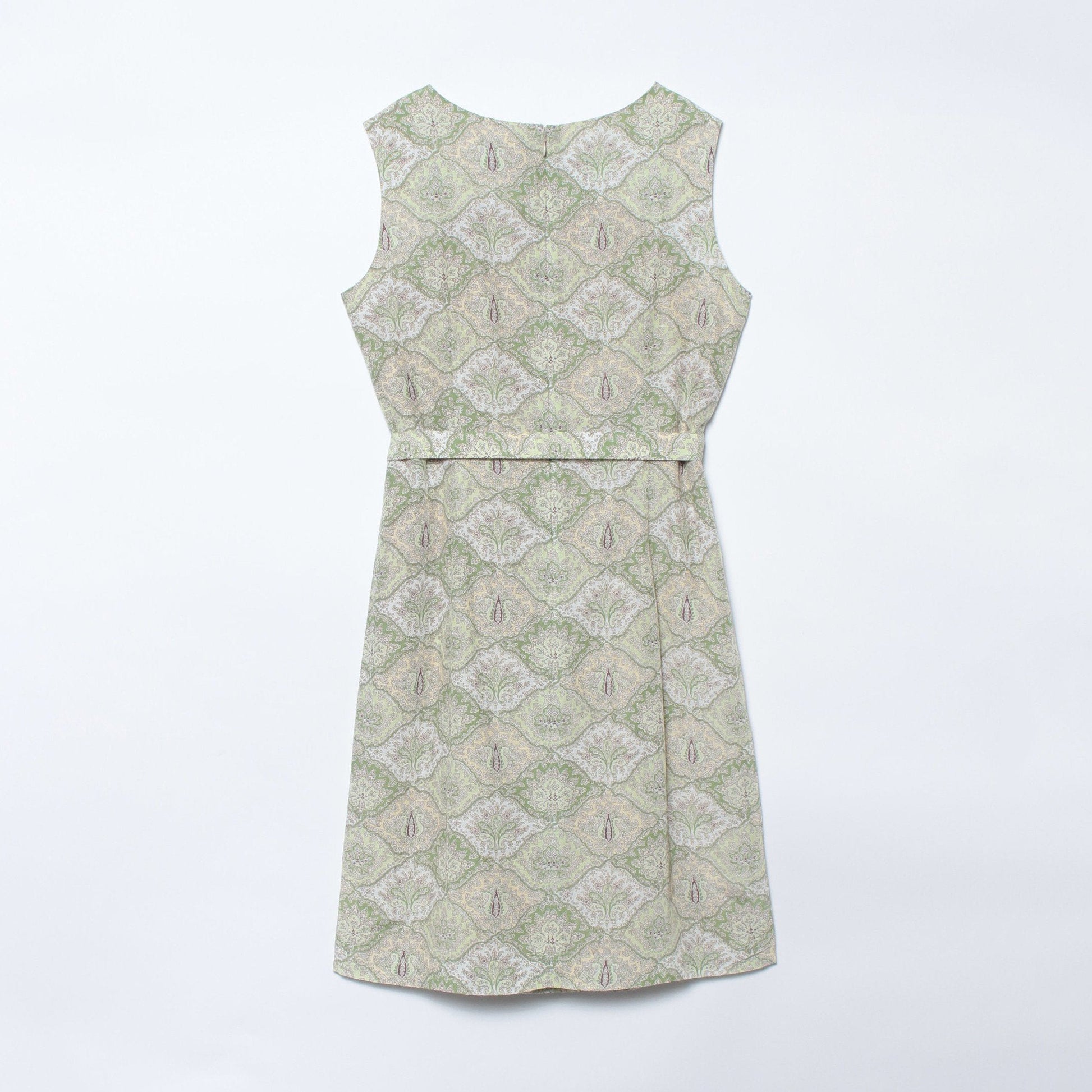 夏の景色に馴染む爽やかな柄を生かしたシンプルなシルエットに、ウエストのタックで程よいアクセントとメリハリを加えました。共布のリボンベルトでウエストマークすればレディな印象が高まります。