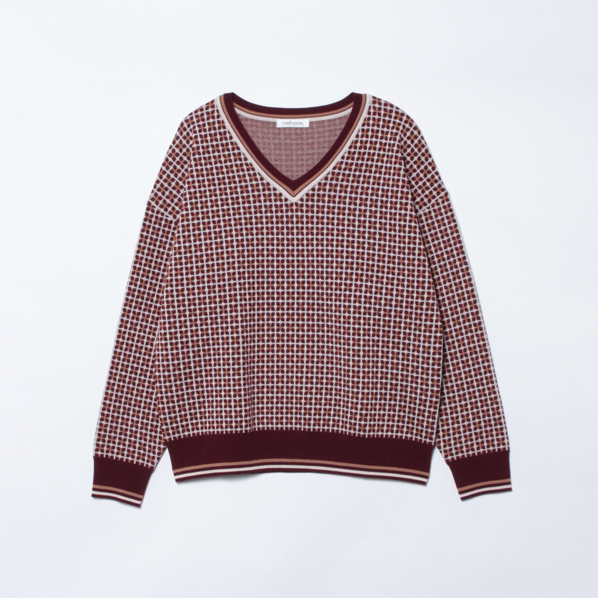 3色構成の格子柄とフチの配色が、トラディショナルなムードを醸し出すジャカードニット。程よいゆとりのある身幅とドロップショルダーがリラックスした雰囲気をもたらし、すっきりしたリブのフチがまとまりの良い着こなしへと導きます。また、パンツやスカートを問わず、ボリュームのあるボトムとも合わせやすい着丈に設定しています。