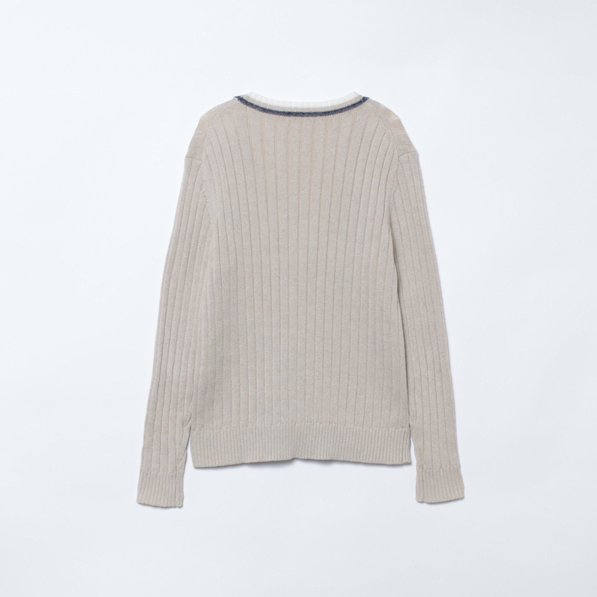 ケーブル柄がポイントになったトラディショナルなチルデンニットを、リネン素材を使うことでこなれた雰囲気に仕上げました。子供っぽくならない配色を意識し、フロントにメランジ感のあるラインを効かせてより味わいのある表情を持たせました。