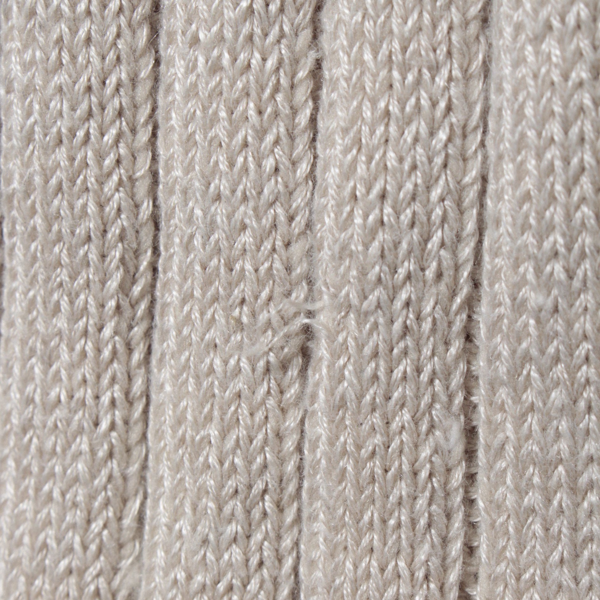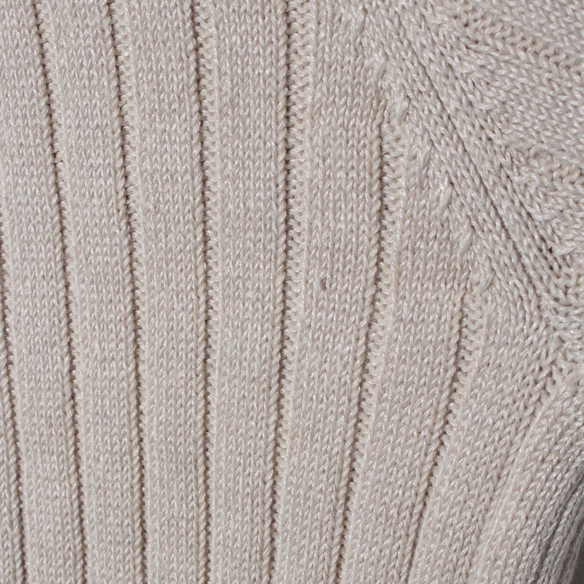 表にリネン糸、裏にポリエステル糸を使用。地糸が表に、添え糸が裏面に表れるプレーティングという編み方によって、リネン糸だけでは難しい凹凸表現を叶えて編み柄を引き立てました。ダレにくくすっきりとした着用感を味わえるのも特徴です。