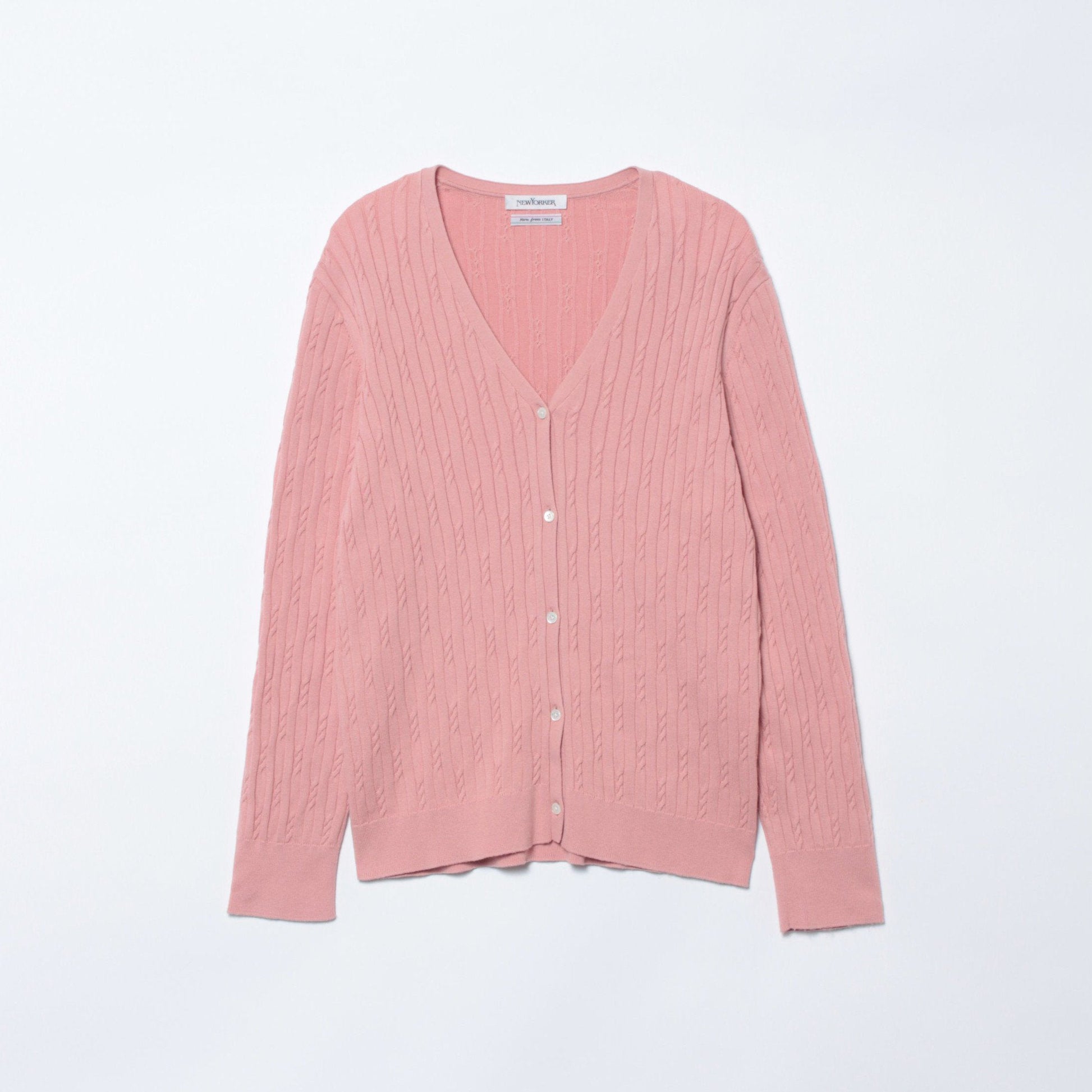 シンプルで汎用性の高い、Vネックの長袖カーディガン。全体にケーブルの編み柄を配し、NEWYORKERらしいトラディショナルな雰囲気をプラスしました。間隔を空けて目を交差させたケーブル柄を互い違いに配置することで、動きのある面持ちに仕上げています。