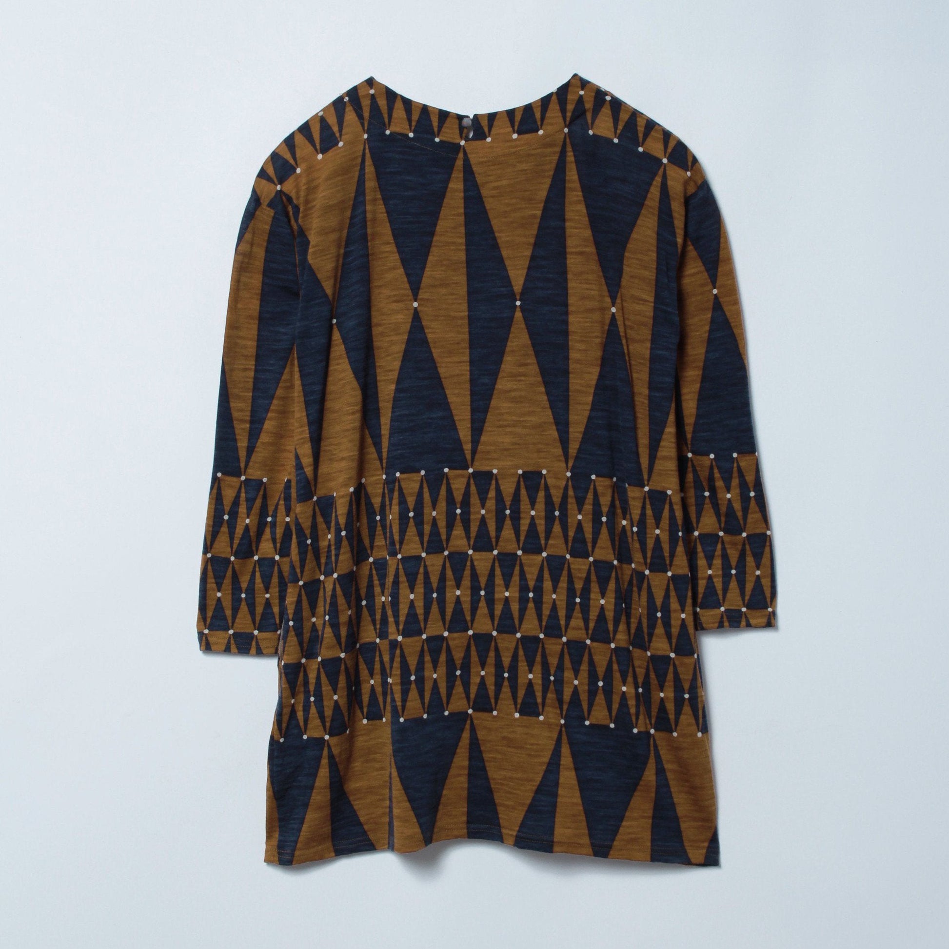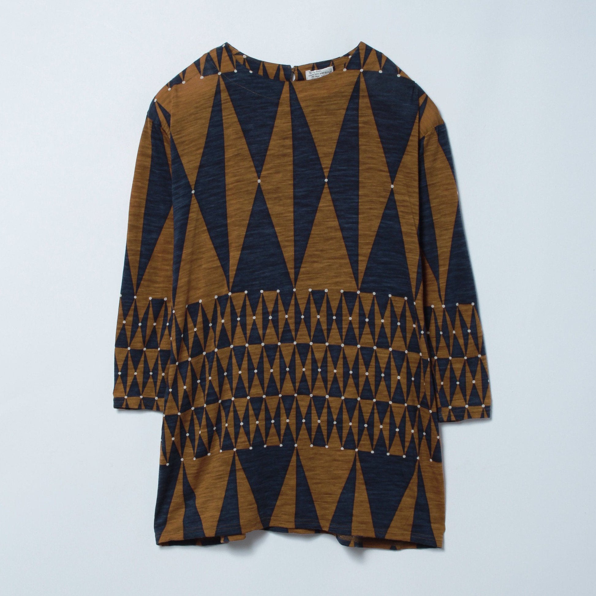 小さな星を繋ぐ楽譜の様な図案「星の歌」。ニュアンスのあるシックな色使いと、大きさの異なるモチーフをくみあわせた、コントラストの強い図案が印象的です。パネルプリントで仕立てたテキスタイルでチュニックをお作りしました。薄手のウール素材のため、柔らかな肌あたりながら暖かくお召し頂けるアイテムです。ドロップショルダーに仕立てた、ゆったりとしたフォルム。パンツと合わせて一枚でお召しいただくほか、インナーにハイネックのカットソーなどと重ねたレイヤードスタイルもおすすめです。