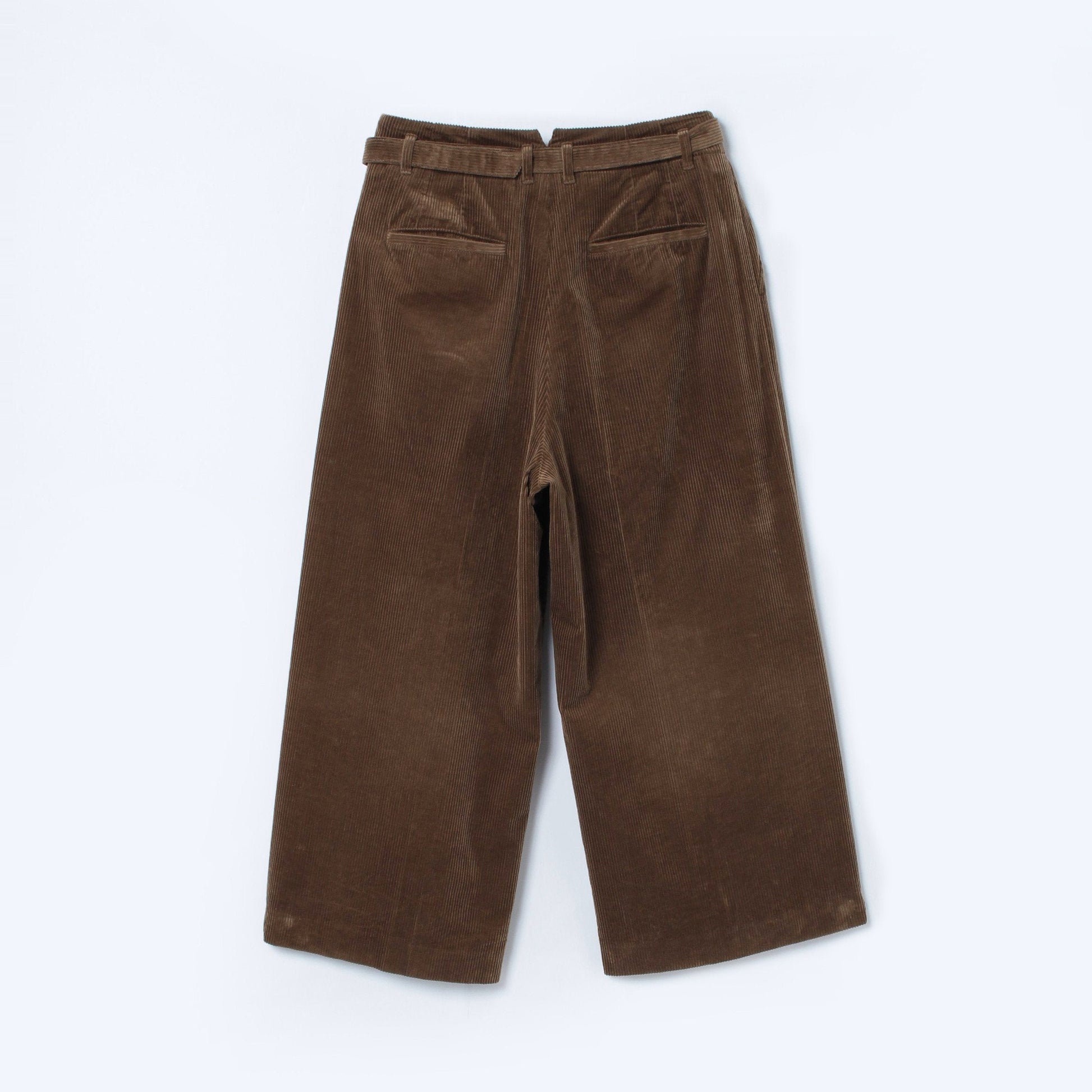 クロップド丈のワイドパンツ。体のラインを拾いにくいゆったりとしたシルエットに、広がり過ぎない裾がバランスの良い仕上がり。クロップド丈は抜け感が出て、コーデュロイを軽やかに見せることに加え、シューズやソックス次第で個性あるコーディネートが楽しめます。さらに、裏地がなく初秋からお召しいただけ、しっかり防寒すれば冬まで活躍。共布のベルトはコーディネートのアクセントに。ポケットあり。