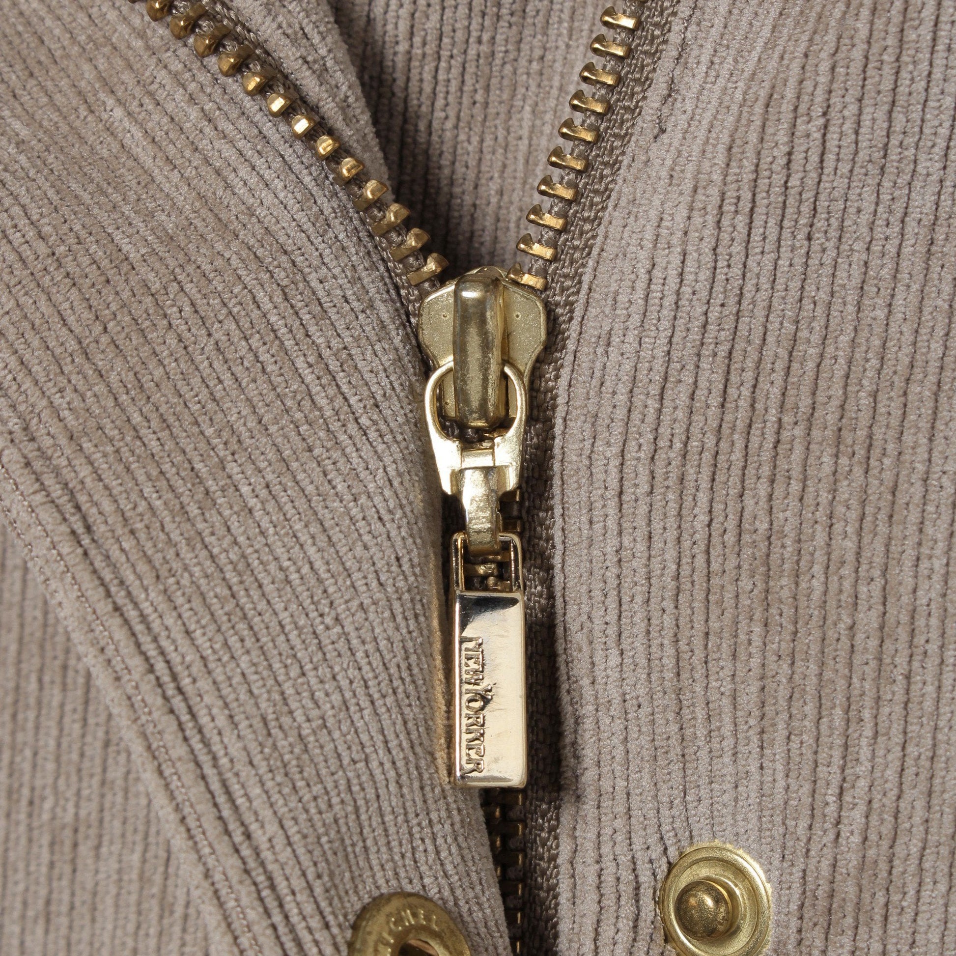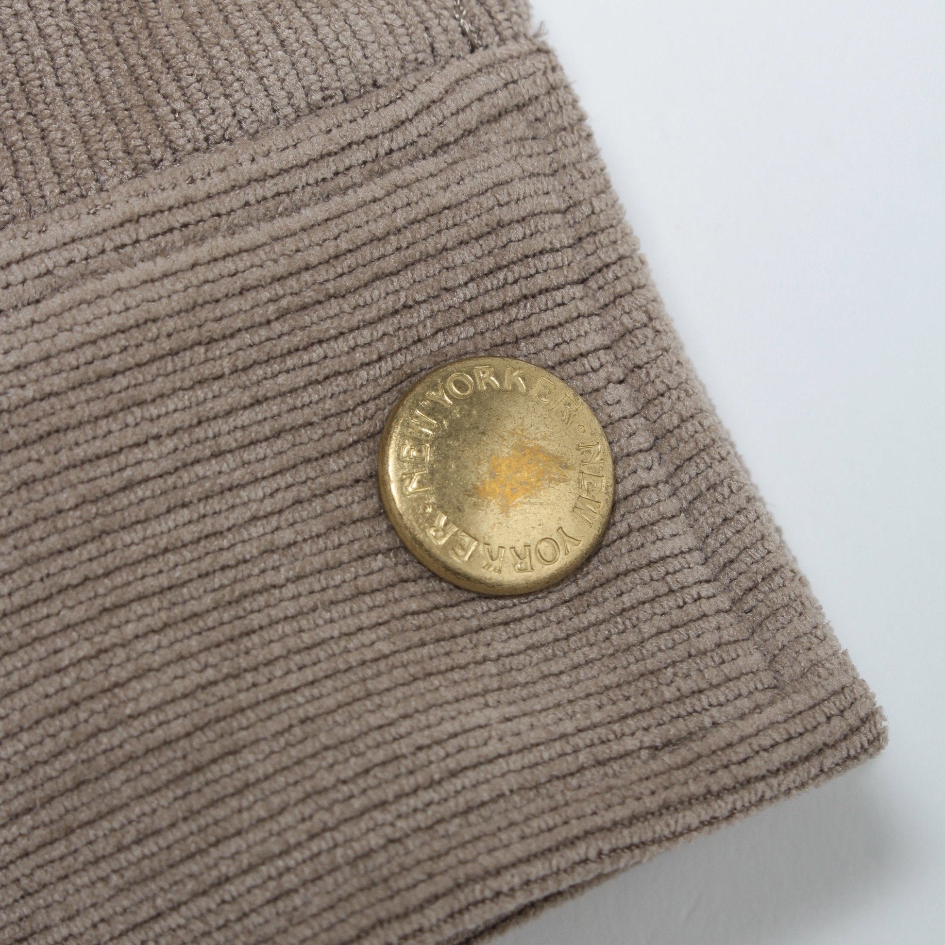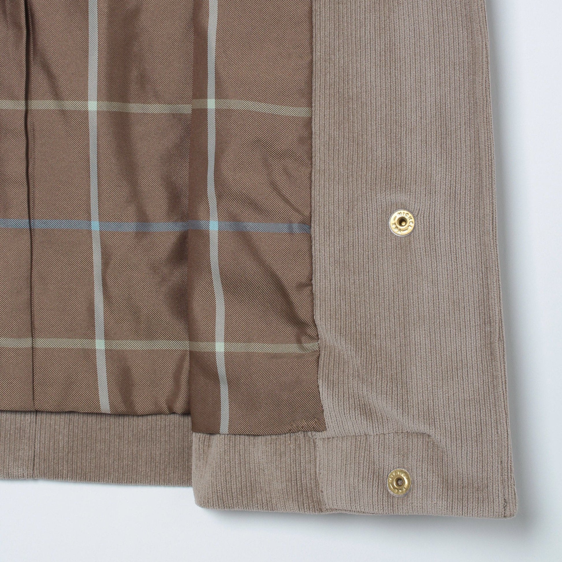 大きめの襟がポイント。フロントを上まで閉めるとアシンメトリーな重ね襟になり、開けて羽織ると襟が肩に広がって小顔に見える視覚効果を発揮します。フロントはジップ&スナップボタン留めの比翼仕様で、スマートなルックスに仕上げました。袖口はロゴ入りのスナップボタン留め。裏地のマルチカラーのタッターソール柄が可愛らしいアクセントになり、袖を通すのが楽しみになる1着です。