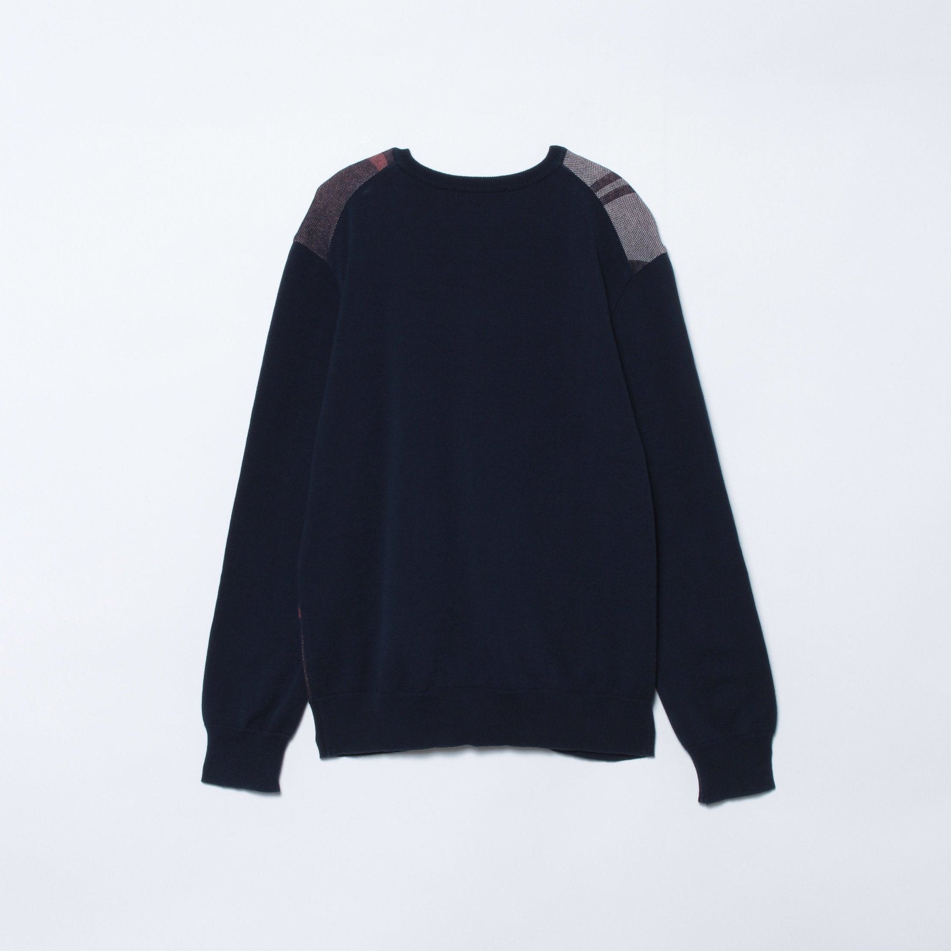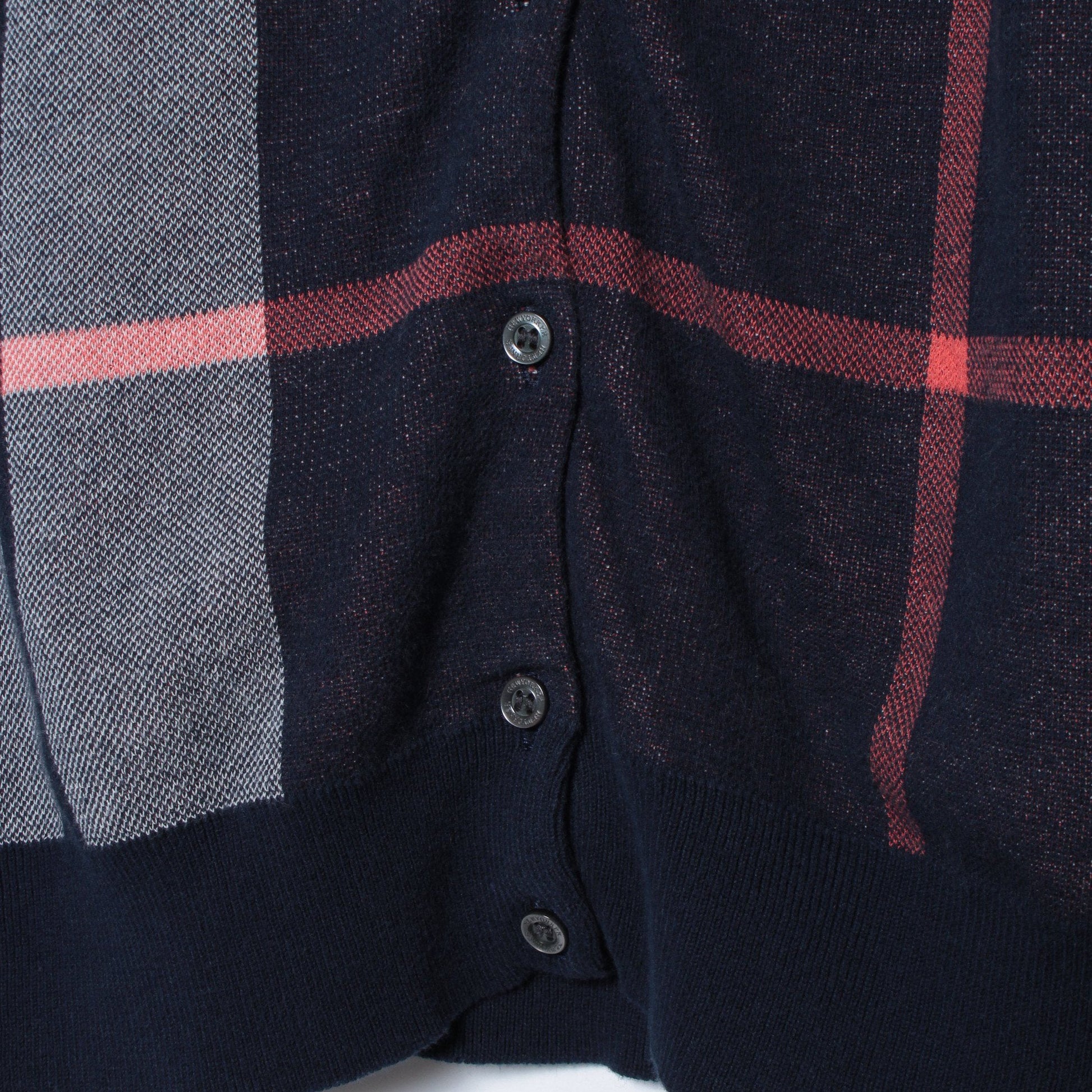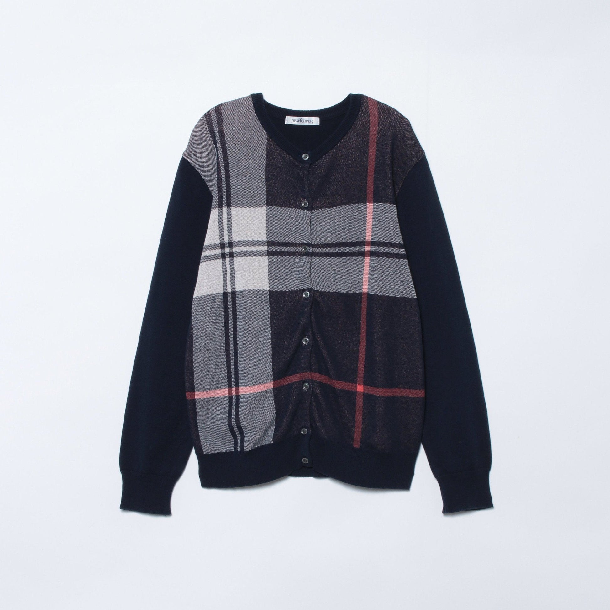 大きく引き伸ばしたグラフィカルなハウスタータンチェックがポイント。袖と後ろ身頃は無地に切り替えることで、すっきりと上品な印象に。襟元が開き過ぎないクルーネックは、ボタンを留めてプルオーバーとしての着用もお楽しみいただけます。