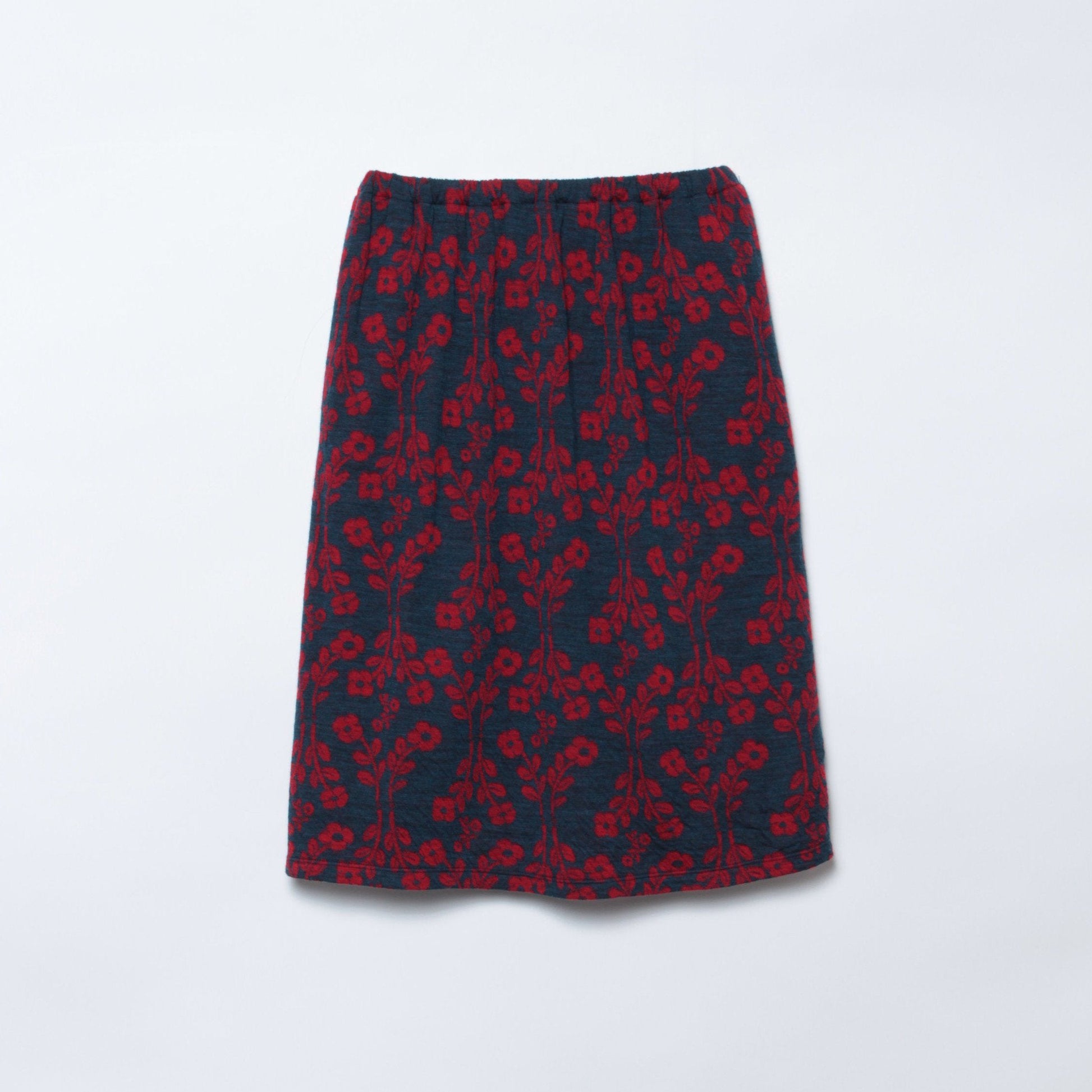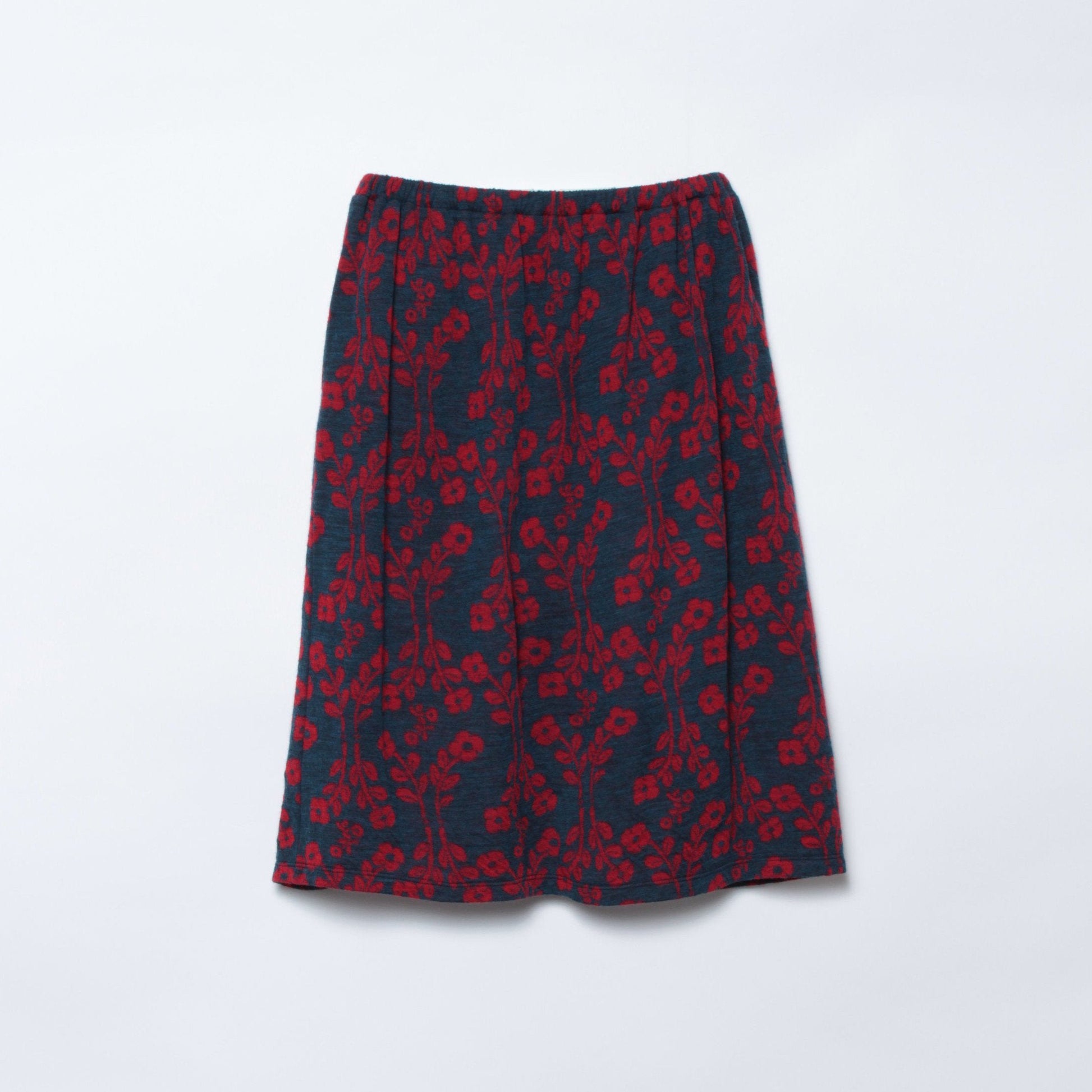 本格的な冬の始まりの前に訪れる暖かな日々。冬の心温まるひと時をイメージした図案「小春日和」は、ウールとレーヨンの混紡糸を使い、柄の縁をぼかしながら柔らかな印象の花をジャカードで描きました。ウエストをゴムギャザーで仕立てたスカートは、内側にリボンを配し、サイズを調整しながらお召しになれます。シワになりにくく、旅行などにも使いやすい1枚です。同素材のトップスとあわせたセットアップスタイルもおすすめです。