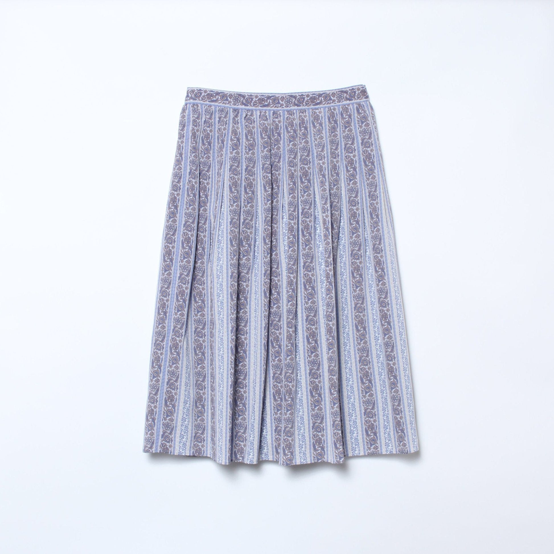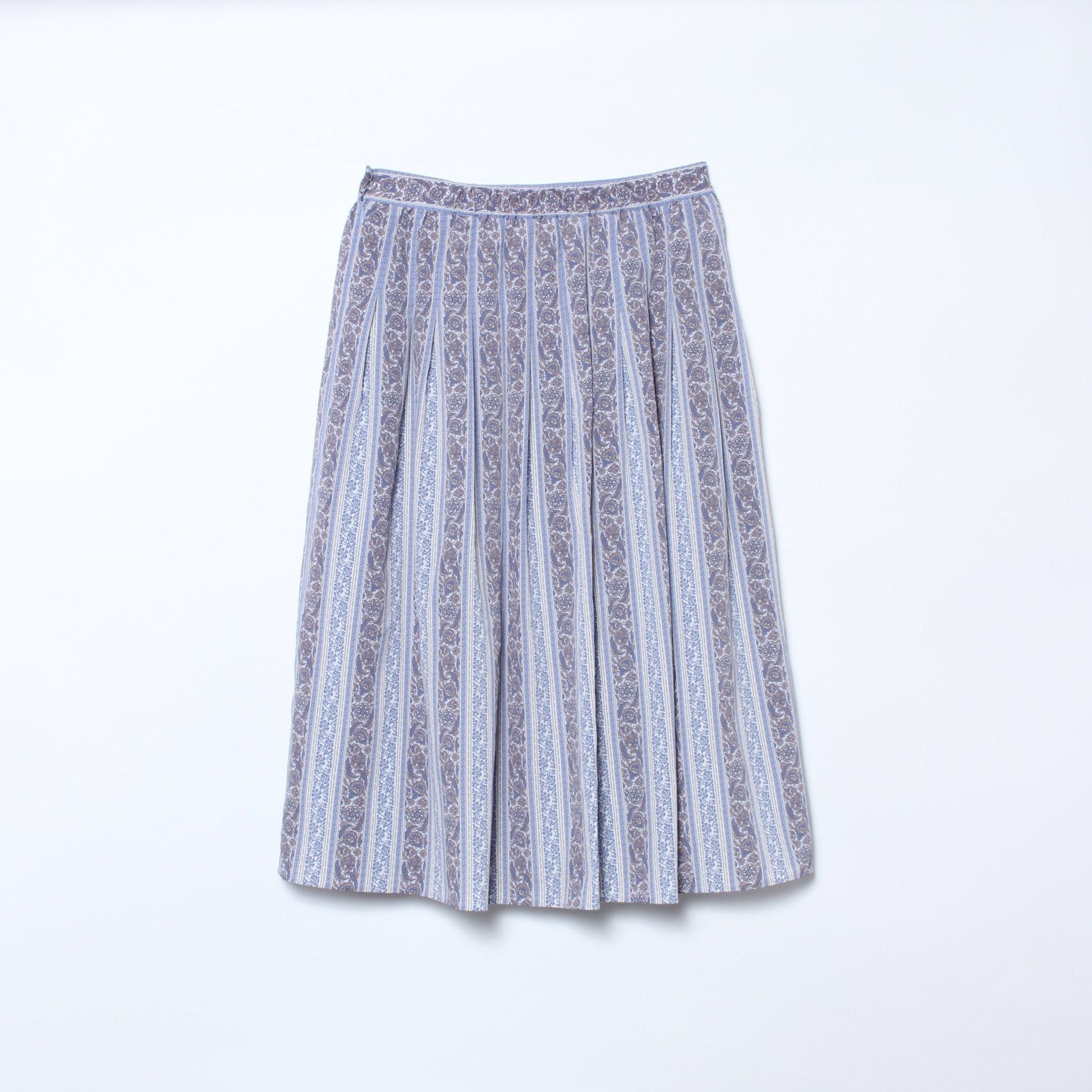膝下丈のフレアスカート。タックの上部を中縫いすることでウエスト周りがすっきり見えるデザインに。また、タック奥から裾にかけて広がるストライプが華やかな印象を与えてくれます。後ろウエストはゴム仕様で、快適な穿き心地も魅力です。裏地あり。右脇のみポケットあり。