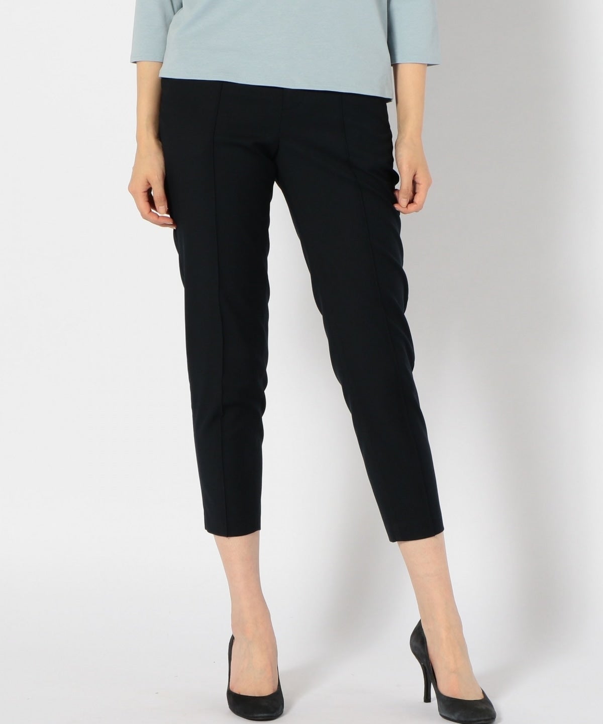 膝下が細身で、センタープリーツが入る事で足が綺麗に見える仕様になっています。シワになりにくい素材なのでお仕事にもおススメの1点。
