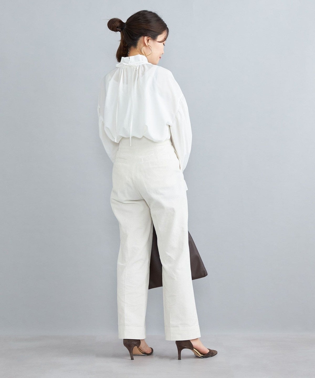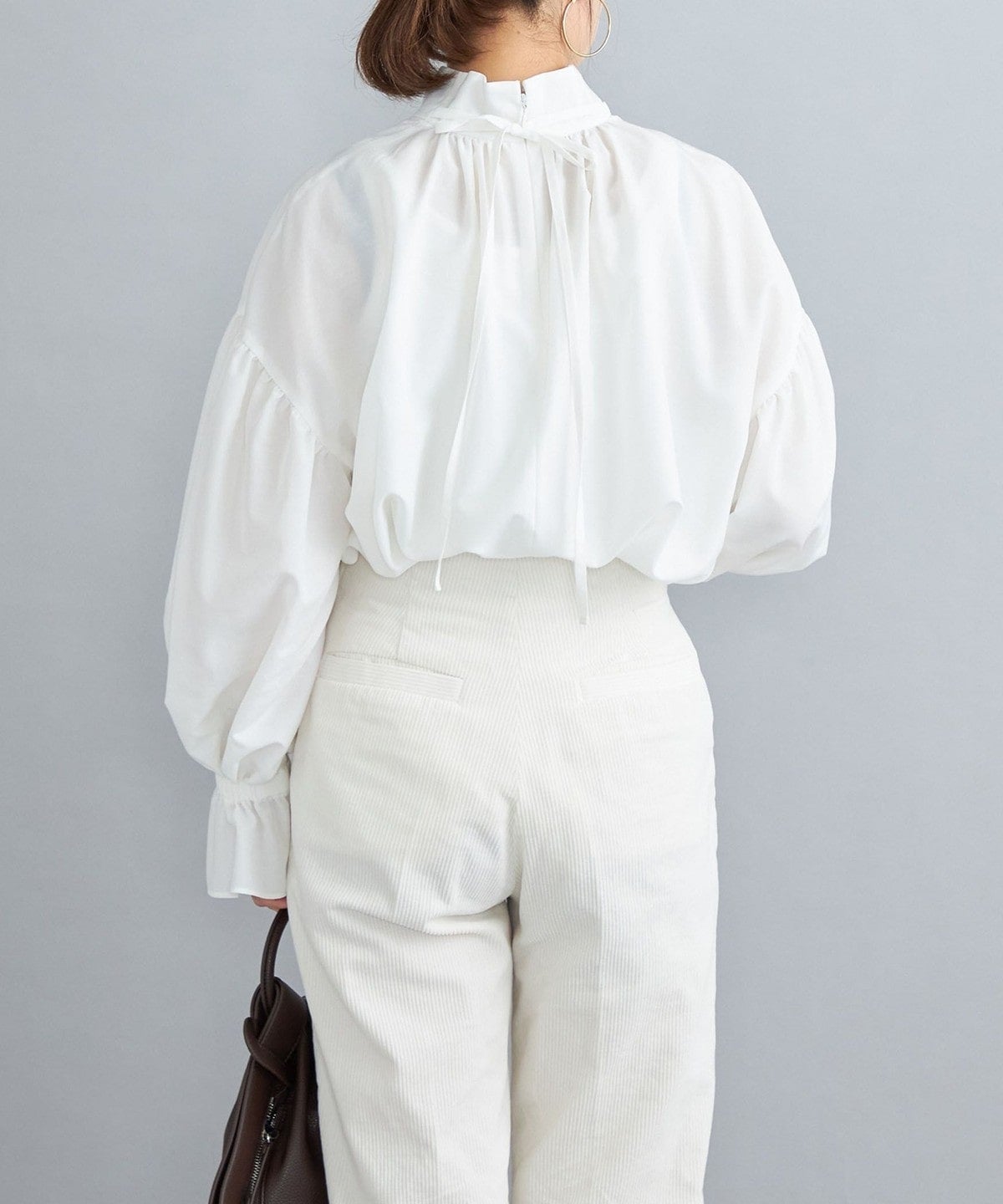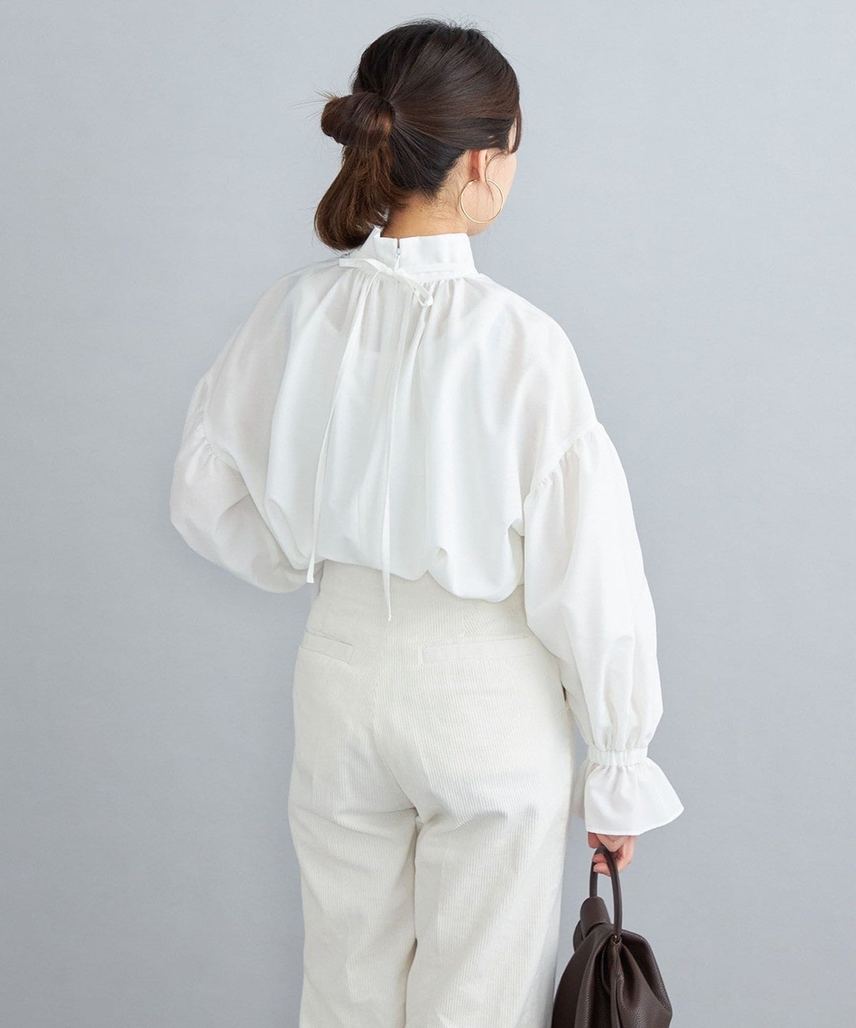 ・程よいきちんと感と上品な女性らしさが備わるスタンドカラーに甘さを加えてリボンが付いています。