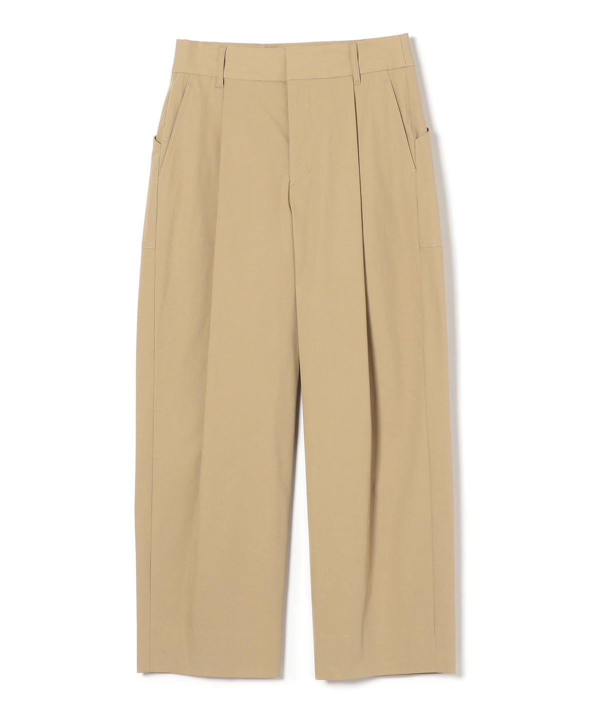 バックに大きめのポケットがあしらわれ、ランダムに入れたタック、裾に施されたボタンを留めることによって違ったシルエットをお楽しみ頂けるのもポイントです。