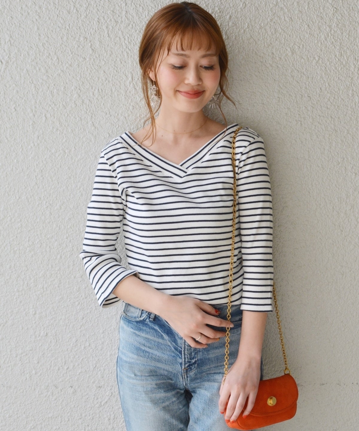 着まわし力抜群のボーダープルオーバー。重なったVネックが女性らしい一枚。程良い厚みのテレコ素材で、春にぴったりのアイテムです。