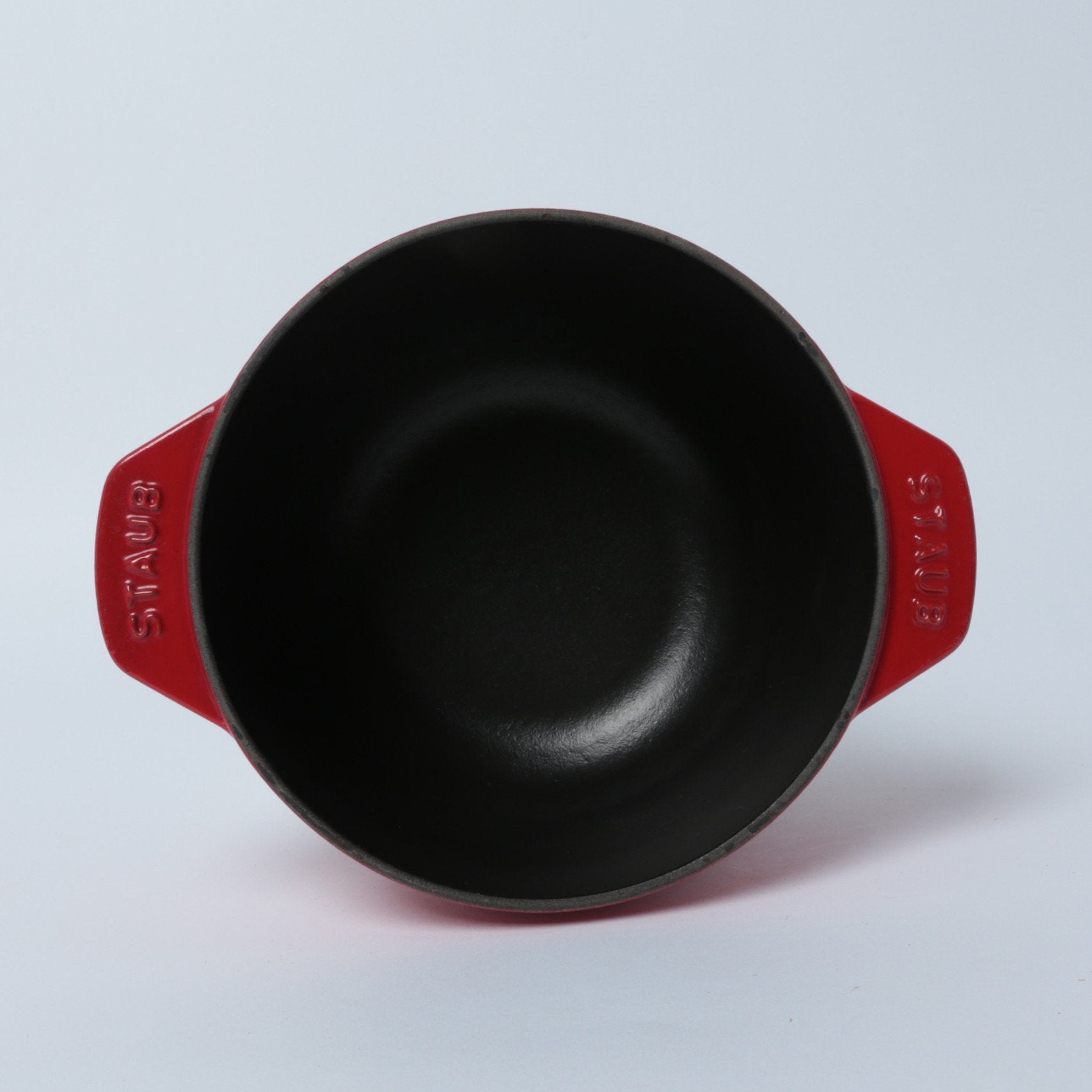 黒マットエマイユ加工:内部はストウブ独自のザラザラ加工。細かな凹凸によって表面積が増えるため油なじみがよく、食材の接点が少なくなり焦げ付きにくくなります。更に熱伝導・保温性が高くテーブルにそのまま出しても温かいまま料理を楽しめます。