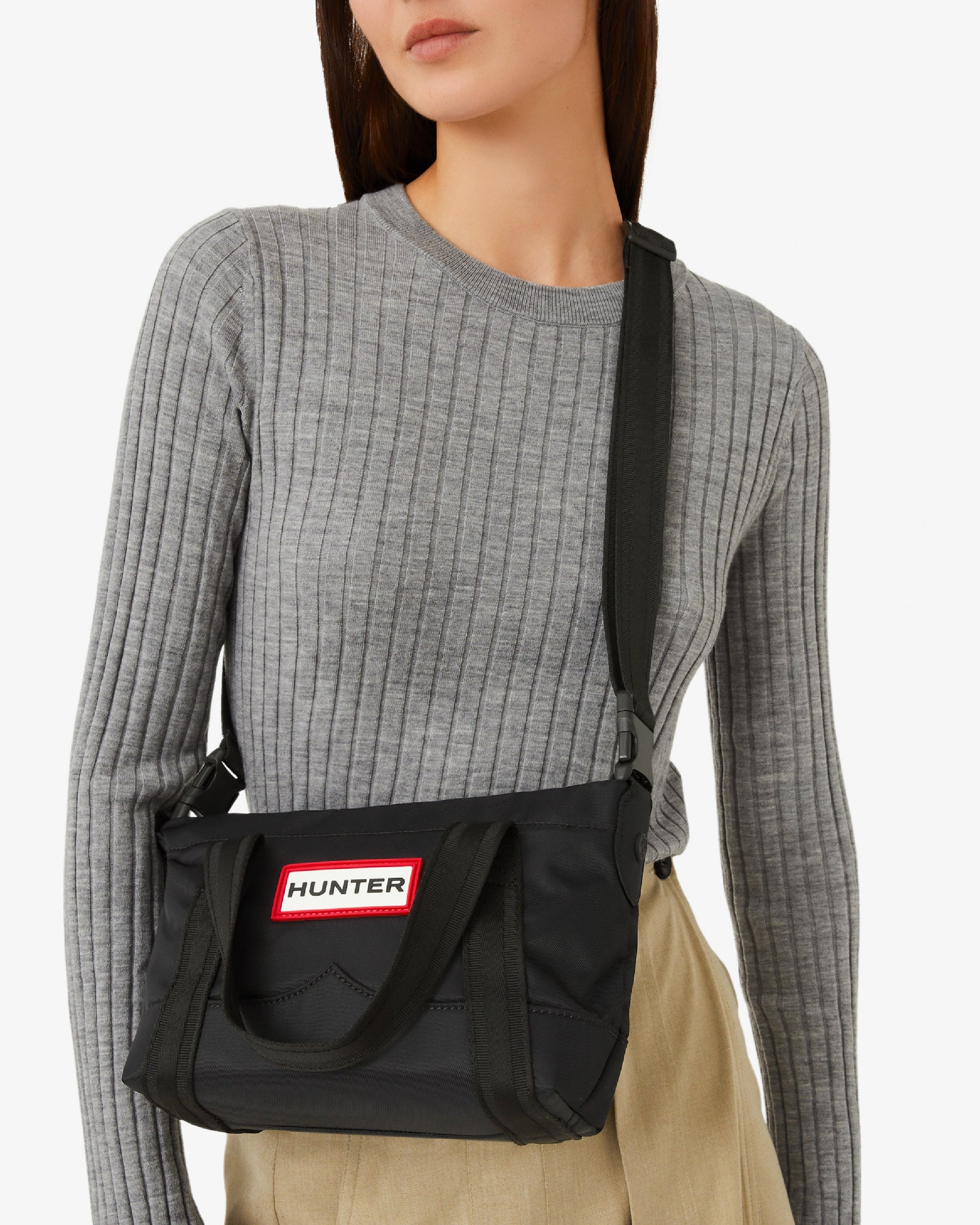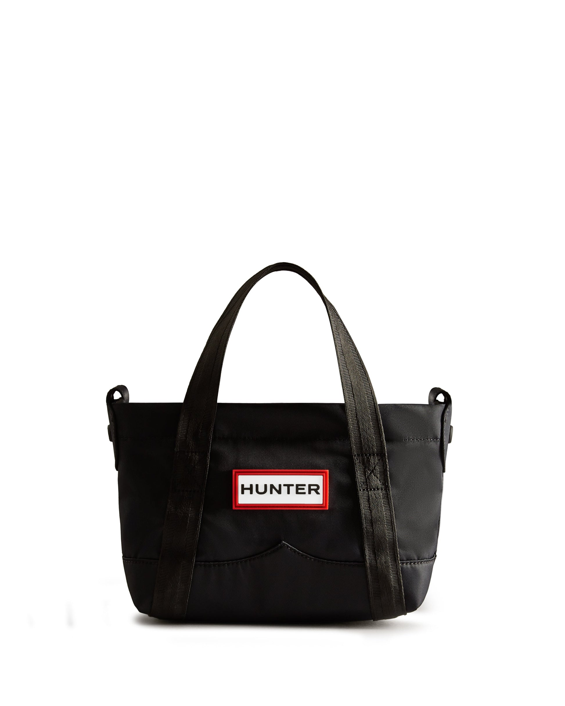 ハンターのナイロンミニトップクリップトートは、耐水性のあるナイロンツイルの表地とリサイクルポリエステルの裏地を使用しています。中身をさらに保護できるような強化されたベースで補完され、日常のハンドバッグとして最適なサイズに仕上がっています。バッグの内側にはポケットがあり、貴重品などの大切な所持品を持ち運べるので、いざという時にスムーズに取り出すことが可能です。ストラップは取り外しと長さ調整が可能で、状況に応じて様々な方法でご使用いただけます。