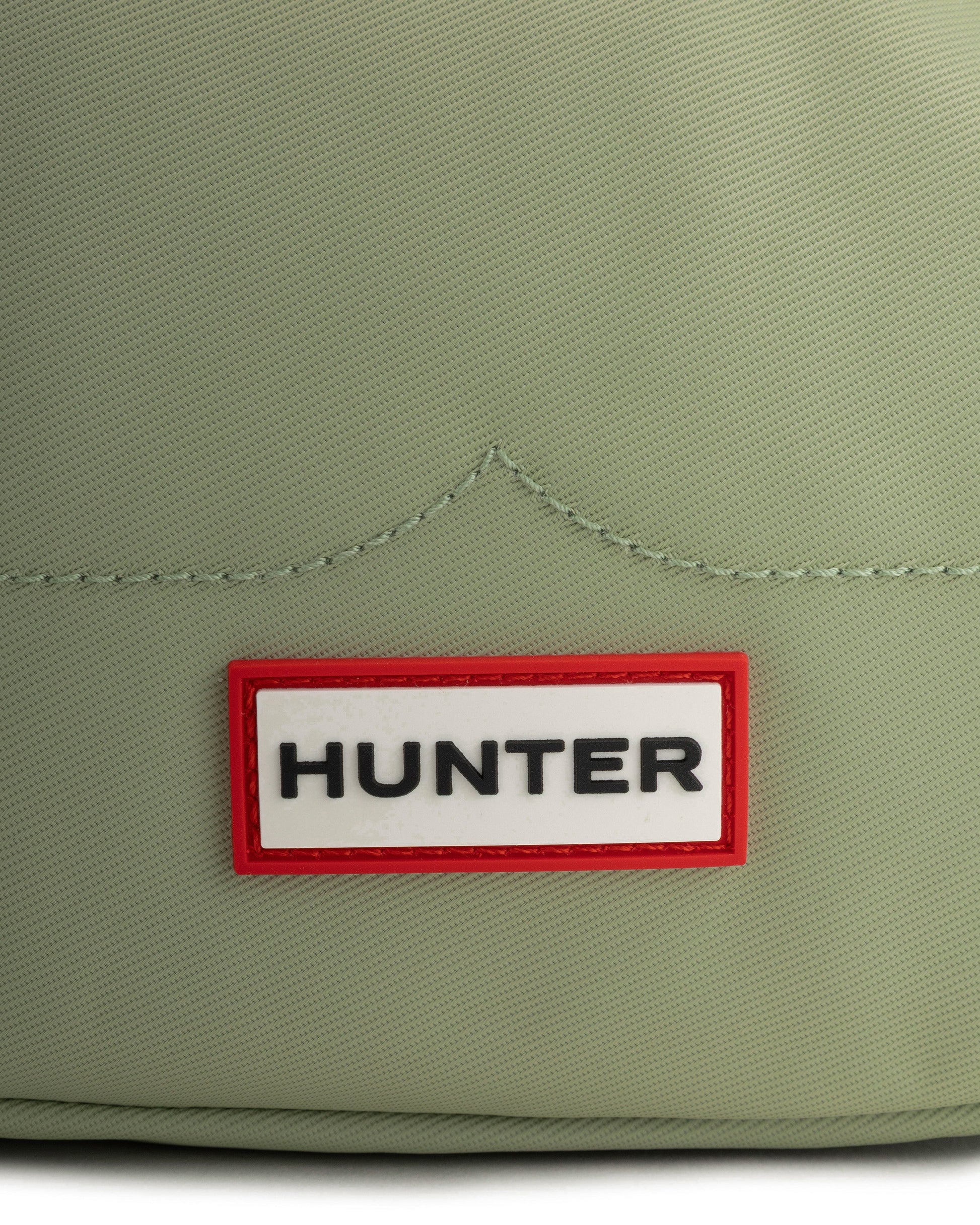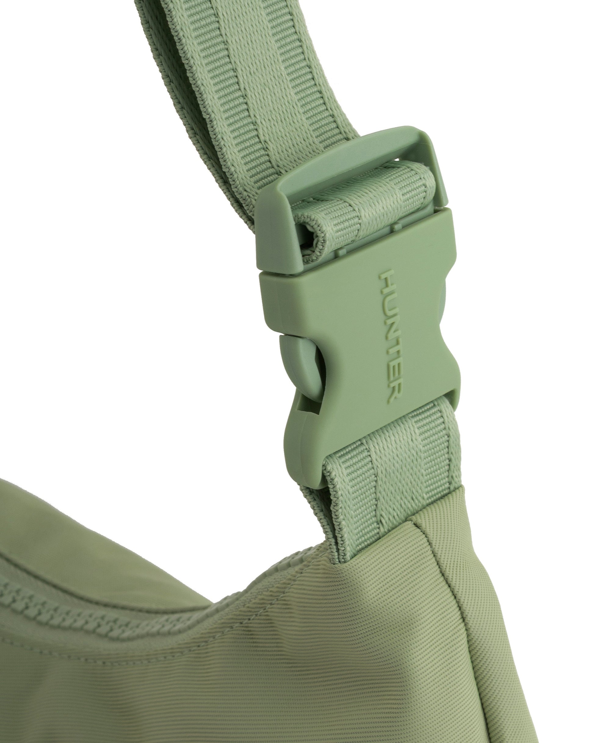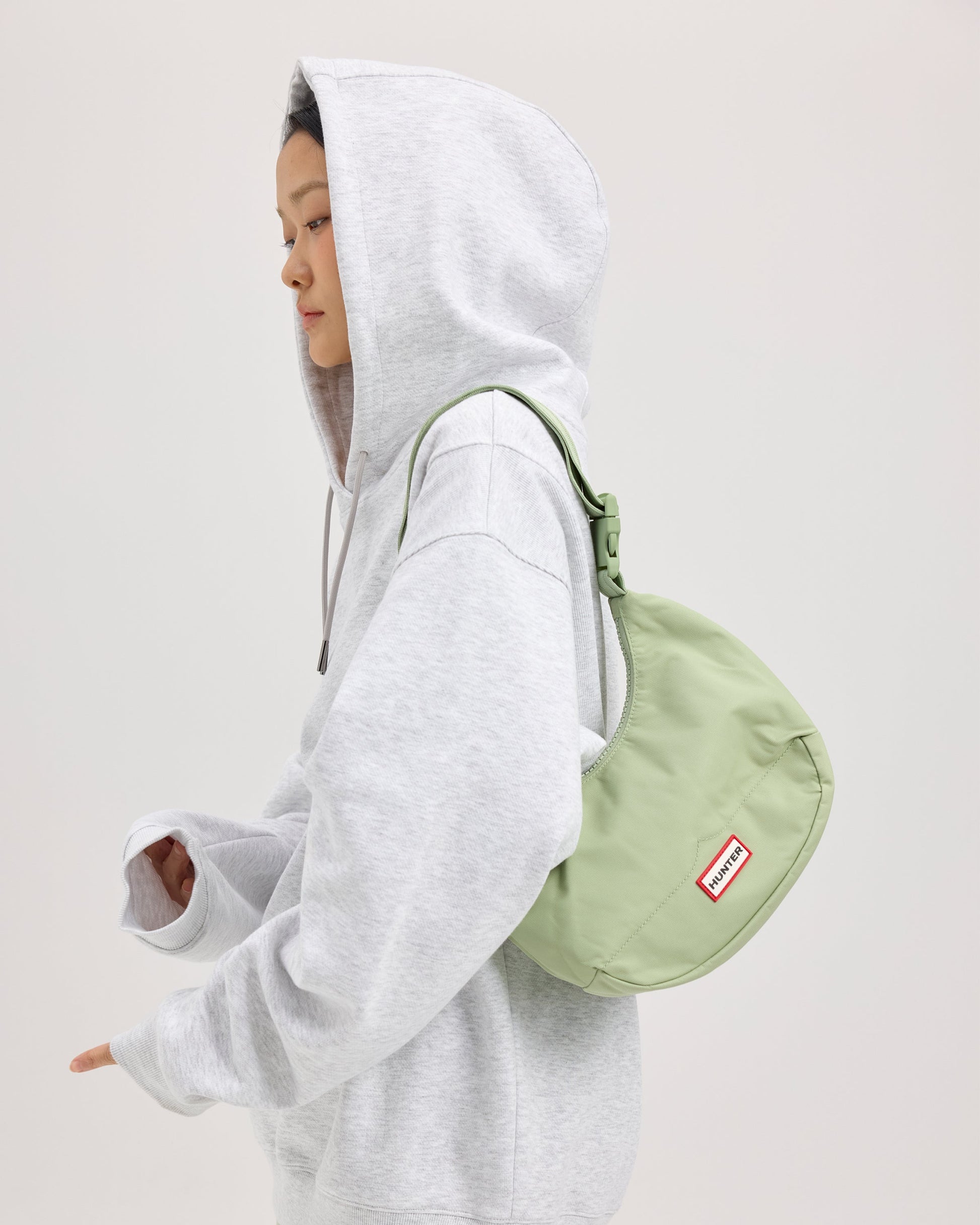 ナイロンミニホーボーは、半月型のデイリーユースに最適な新しいシルエットのバックです。外側は耐水性のリサイクルナイロン、裏地にはリサイクルポリエステルのライニングを使用しています。ストラップは長さ調節が可能でショルダーバッグとしてもクロスボディとしても使用できます。ハンターのシグネチャーであるエンボス加工のトップクリップが付いています。