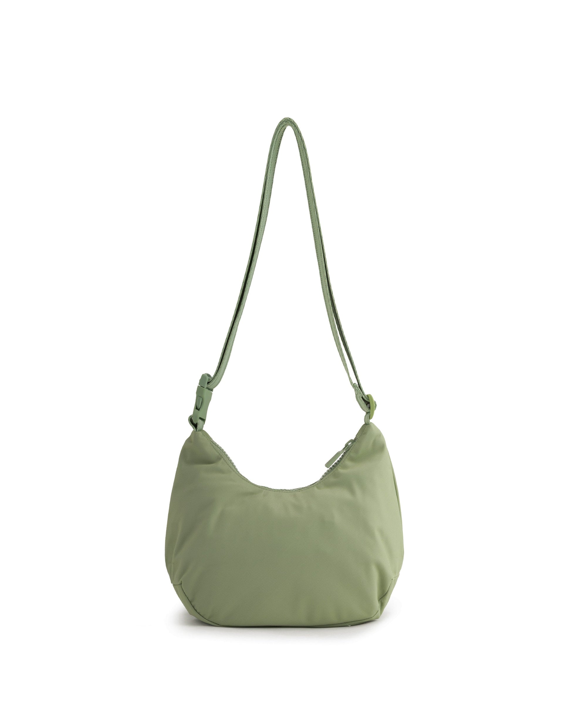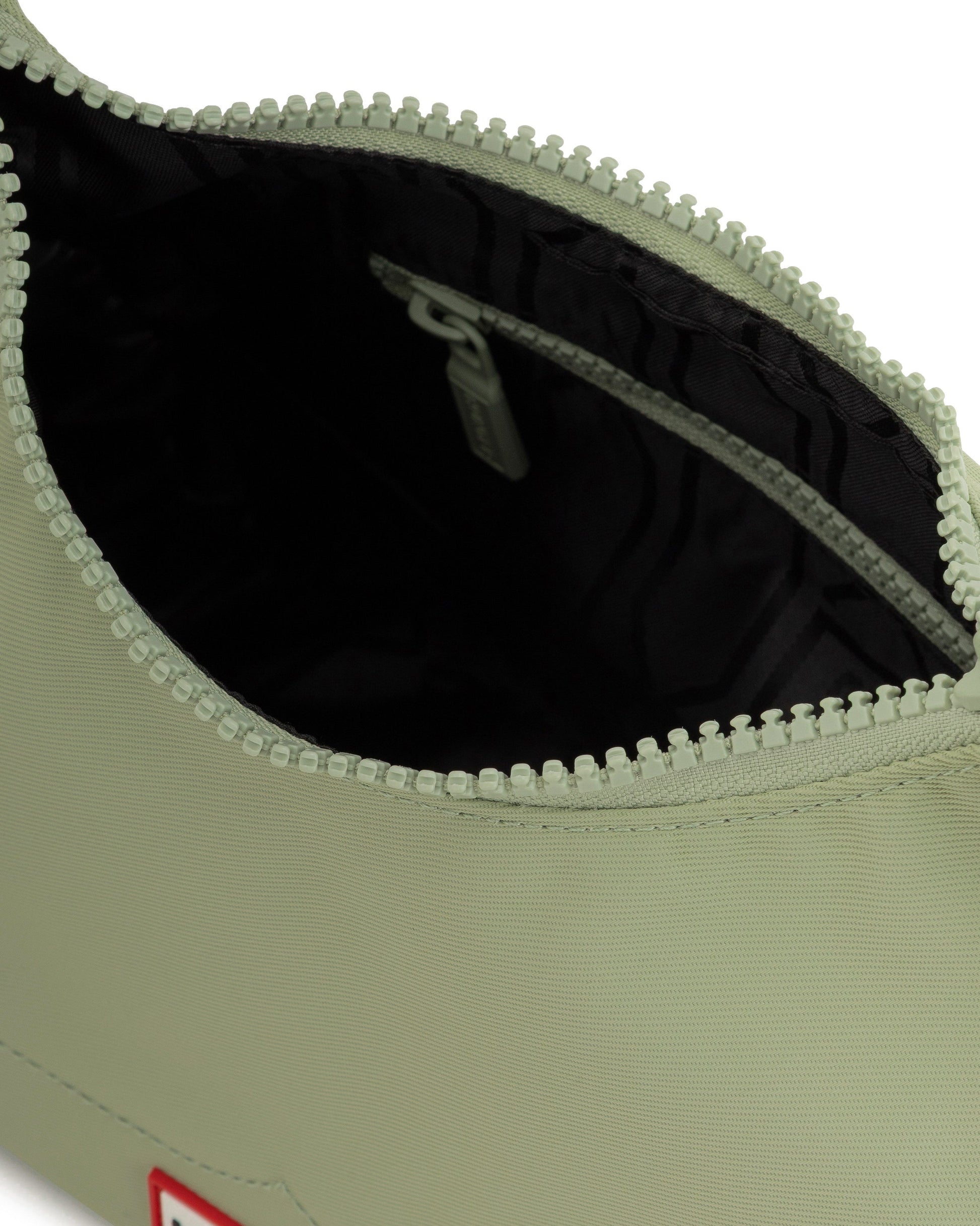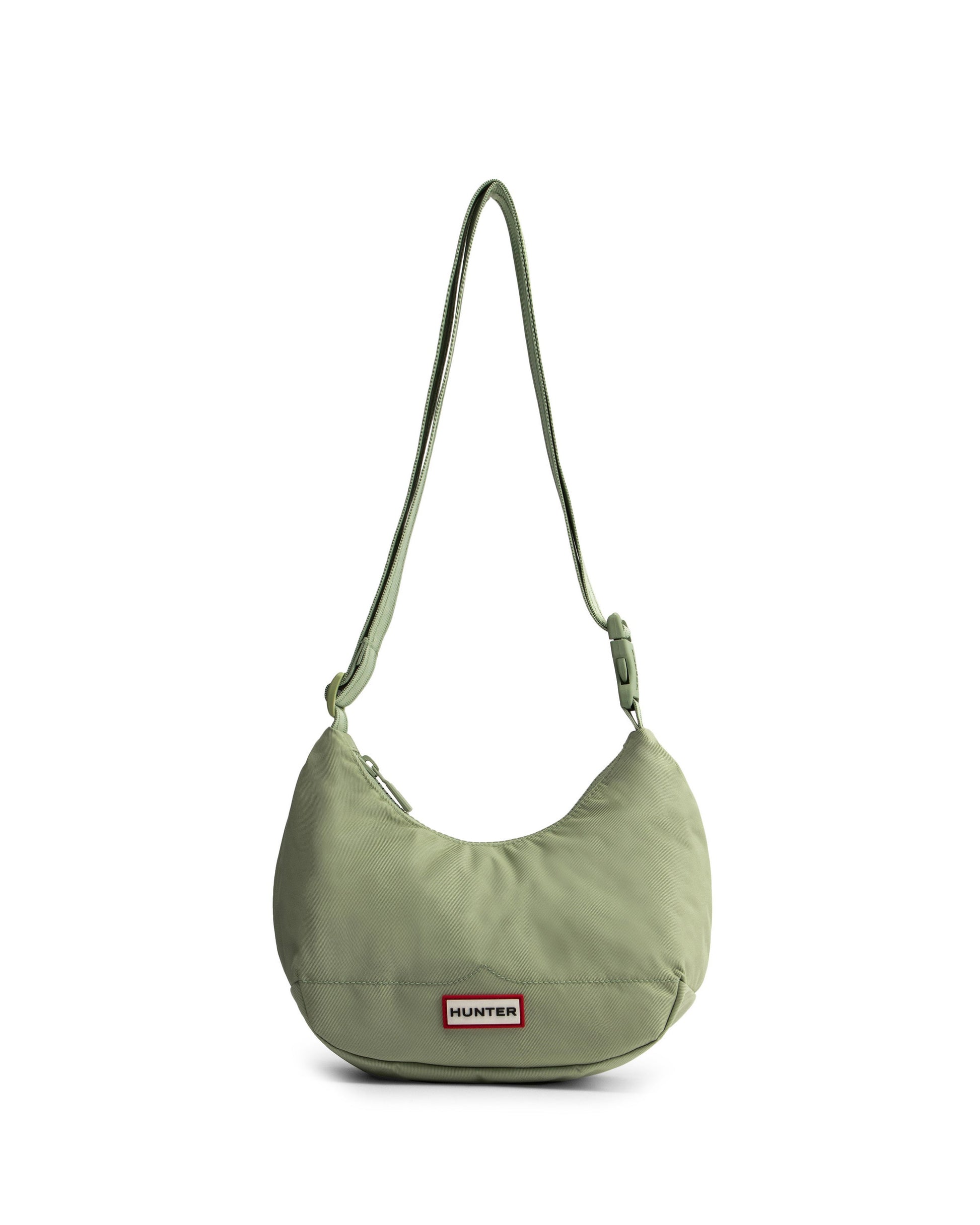 ナイロンミニホーボーは、半月型のデイリーユースに最適な新しいシルエットのバックです。外側は耐水性のリサイクルナイロン、裏地にはリサイクルポリエステルのライニングを使用しています。ストラップは長さ調節が可能でショルダーバッグとしてもクロスボディとしても使用できます。ハンターのシグネチャーであるエンボス加工のトップクリップが付いています。