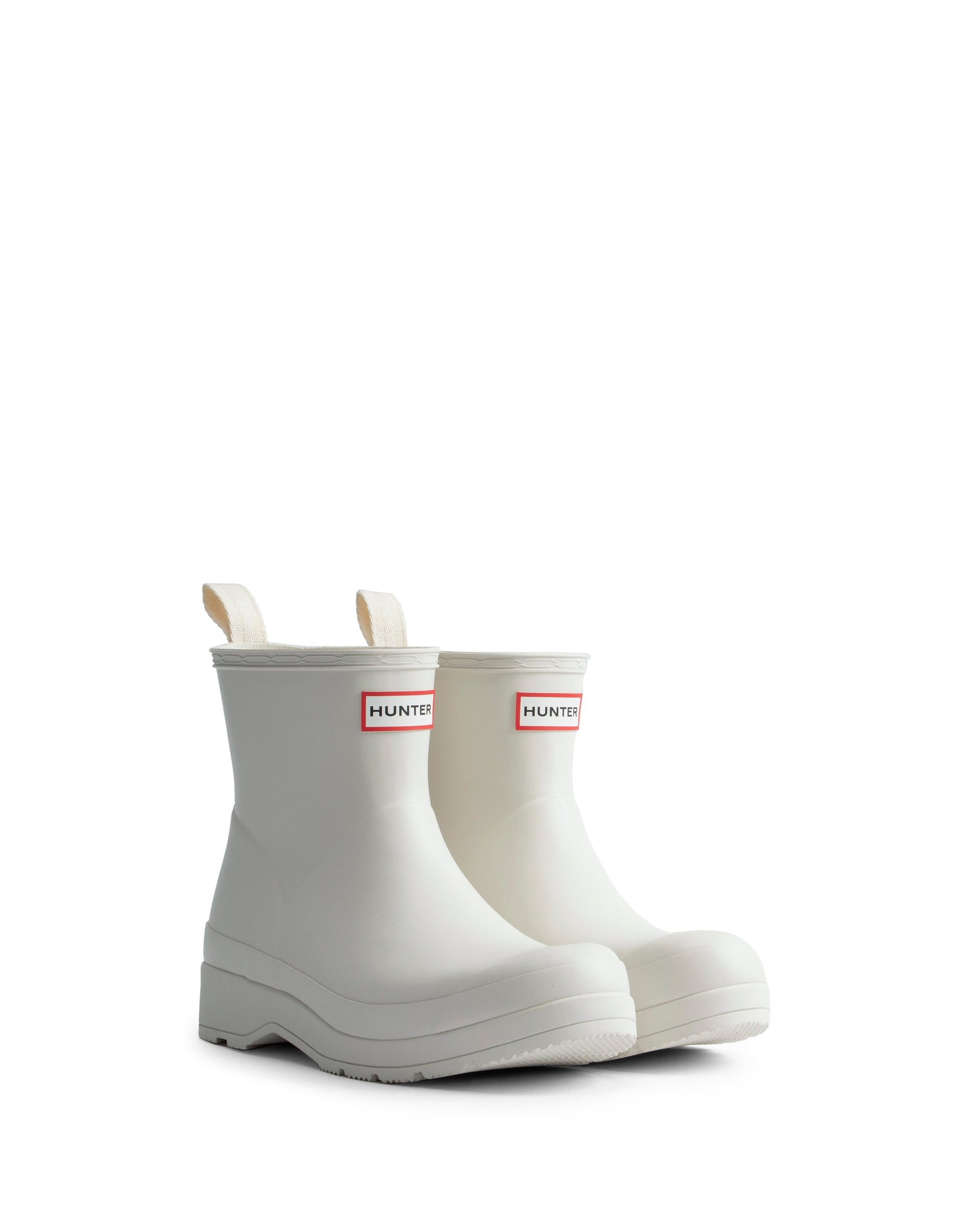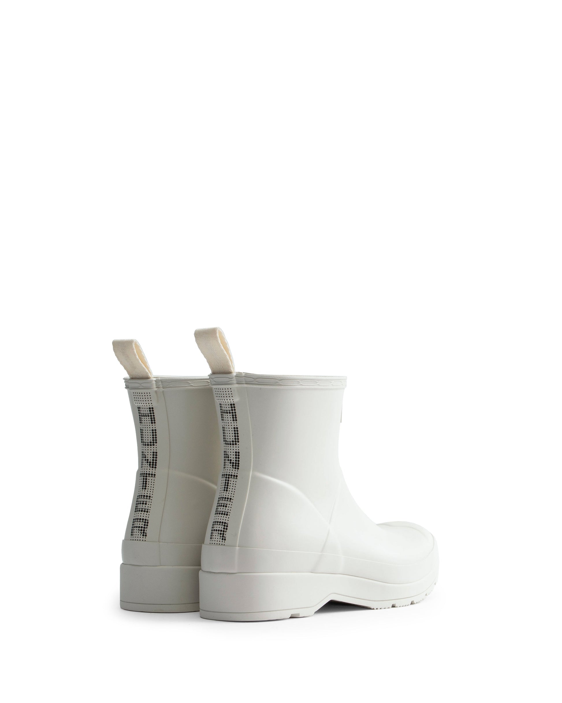ベストセラーのバックストラップブーツをアップデートしたSS24シーズンのプレイブーツは、偏光ドットによる目の錯覚を利用したHunterロゴプリントをあしらっています。ユニセックスなシルエットで、平らなソールと角度のついたブロックヒールで快適な履き心地を実現しました。最高品質の100%防水天然ゴムを使用し、リサイクルポリエステルのライニングを施しています。