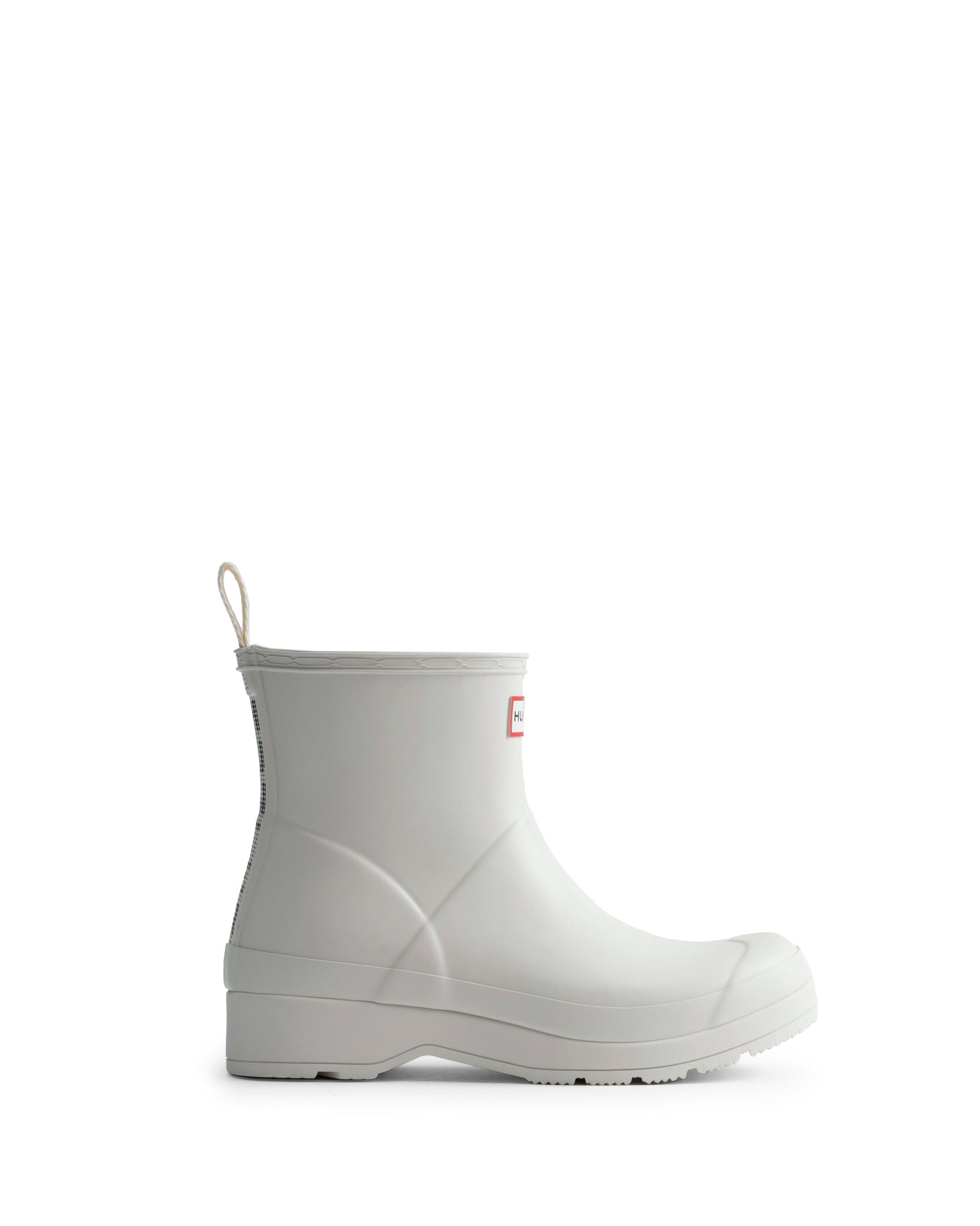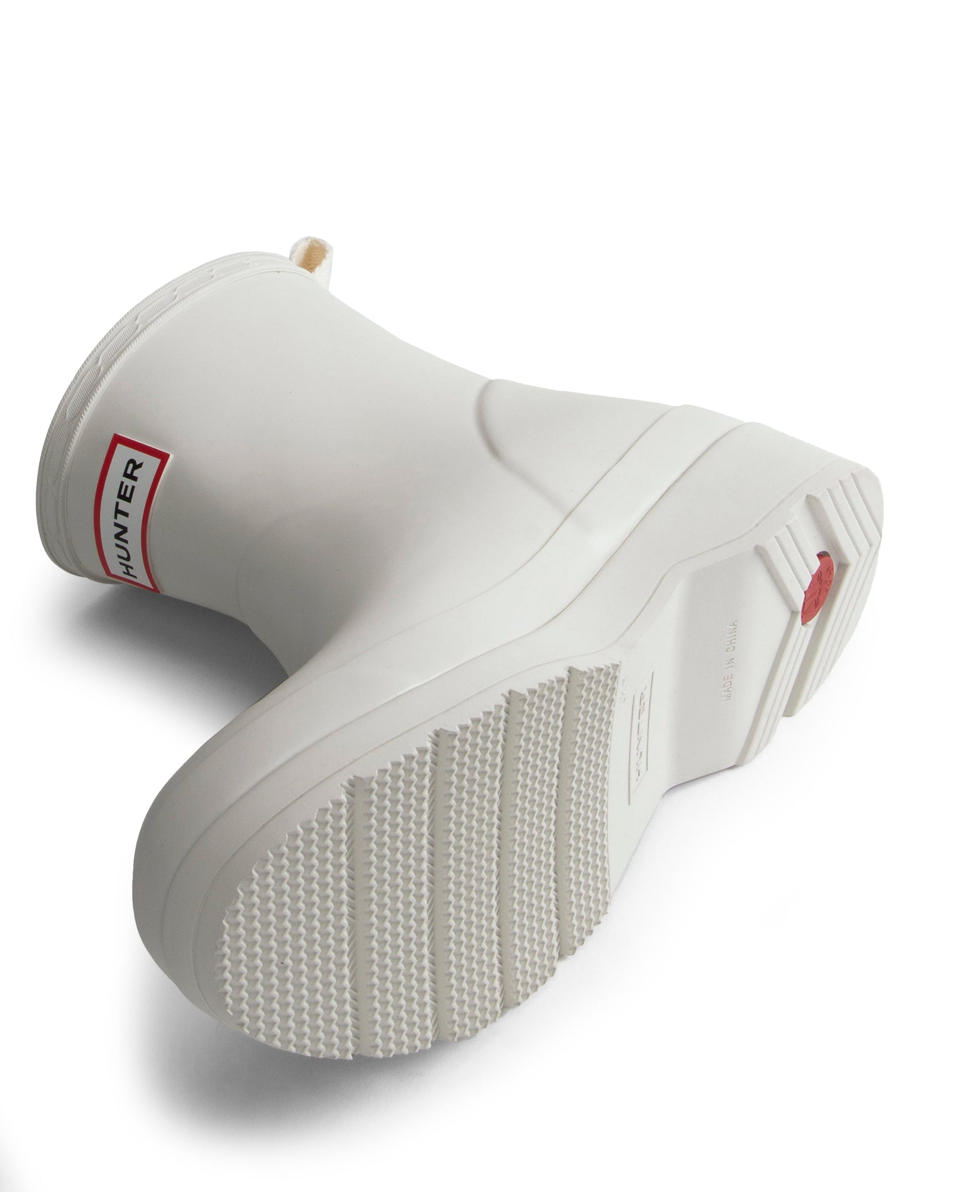 ベストセラーのバックストラップブーツをアップデートしたSS24シーズンのプレイブーツは、偏光ドットによる目の錯覚を利用したHunterロゴプリントをあしらっています。ユニセックスなシルエットで、平らなソールと角度のついたブロックヒールで快適な履き心地を実現しました。最高品質の100%防水天然ゴムを使用し、リサイクルポリエステルのライニングを施しています。