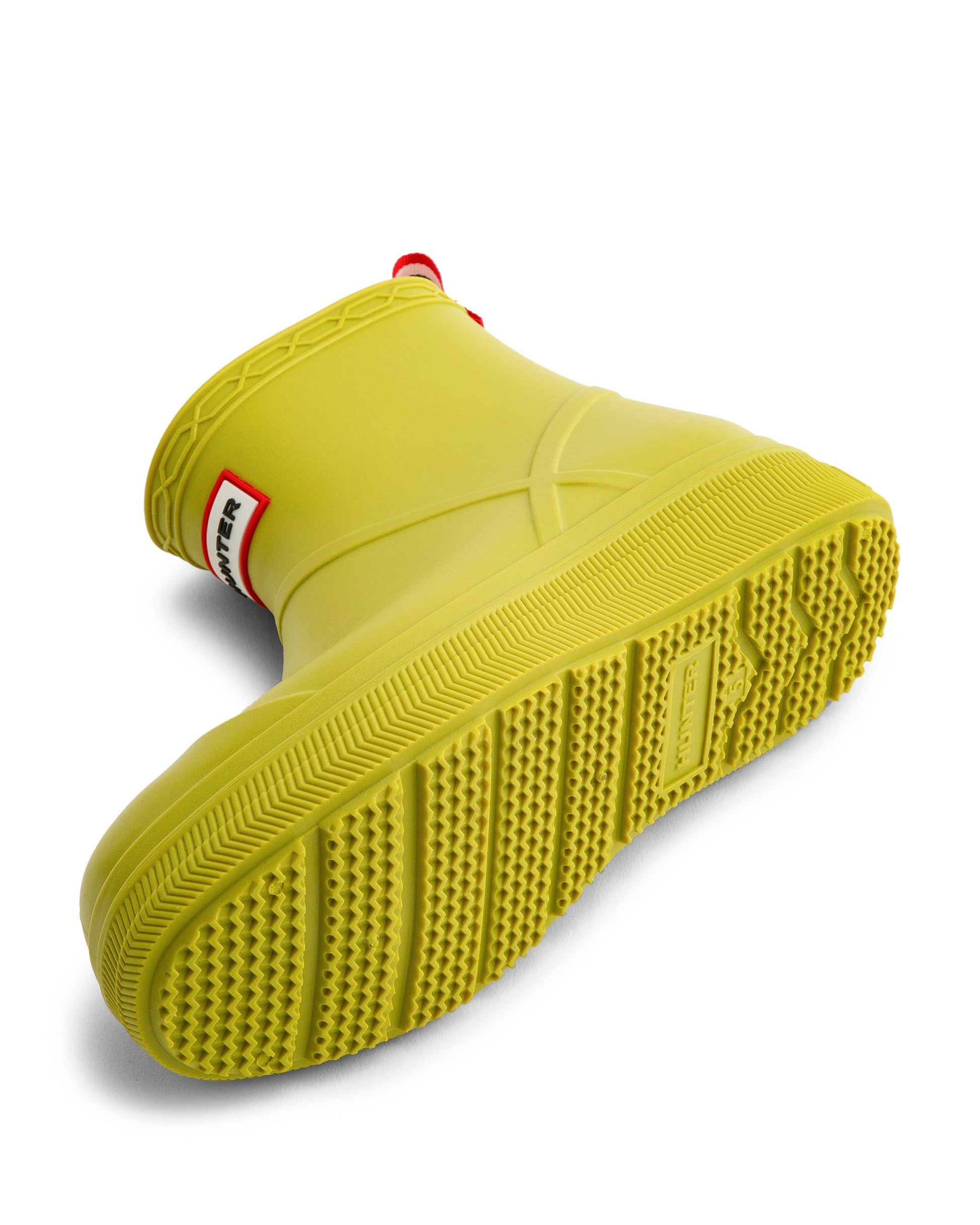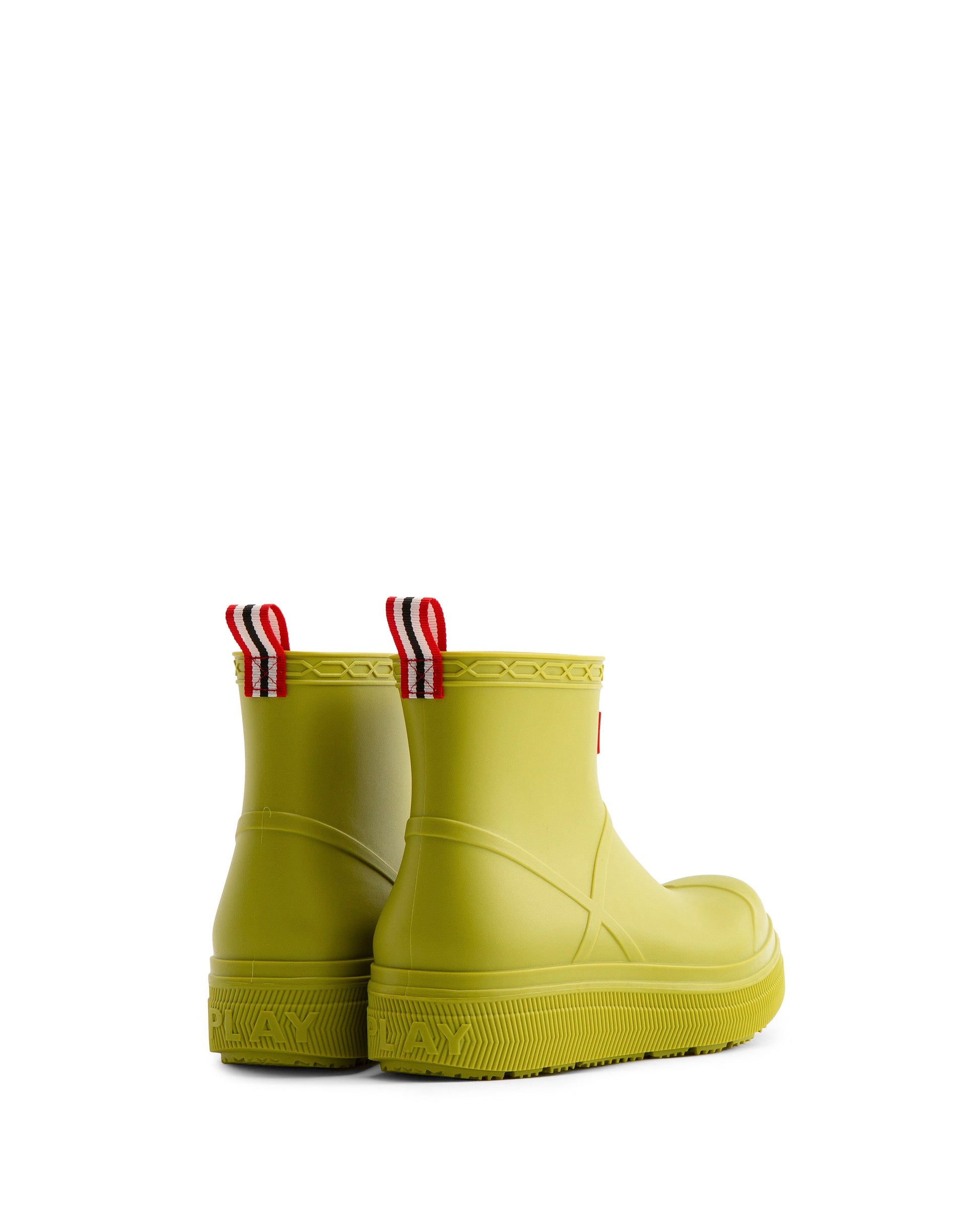 ハンターのベストセラー「プレイブーツ」が新しく生まれ変わってデビューします。この新しいプレイモールデットブーツは、人気のプレイブーツのディテールはそのままに、PVC素材であることそして豊富なカラーバリエーションが大きな特徴です。ソールにはPLAYのエンボス加工が施されています。100%防水で、足首の上まですっぽりと覆うフラットなプラットフォームソールは、脱ぎ履きもし易く快適な履き心地を提供します。雨の日だけでなく、フェスなどのアウトドアシーンにも大活躍のレインブーツです。背面には、着脱に便利なプルタブが付いています。