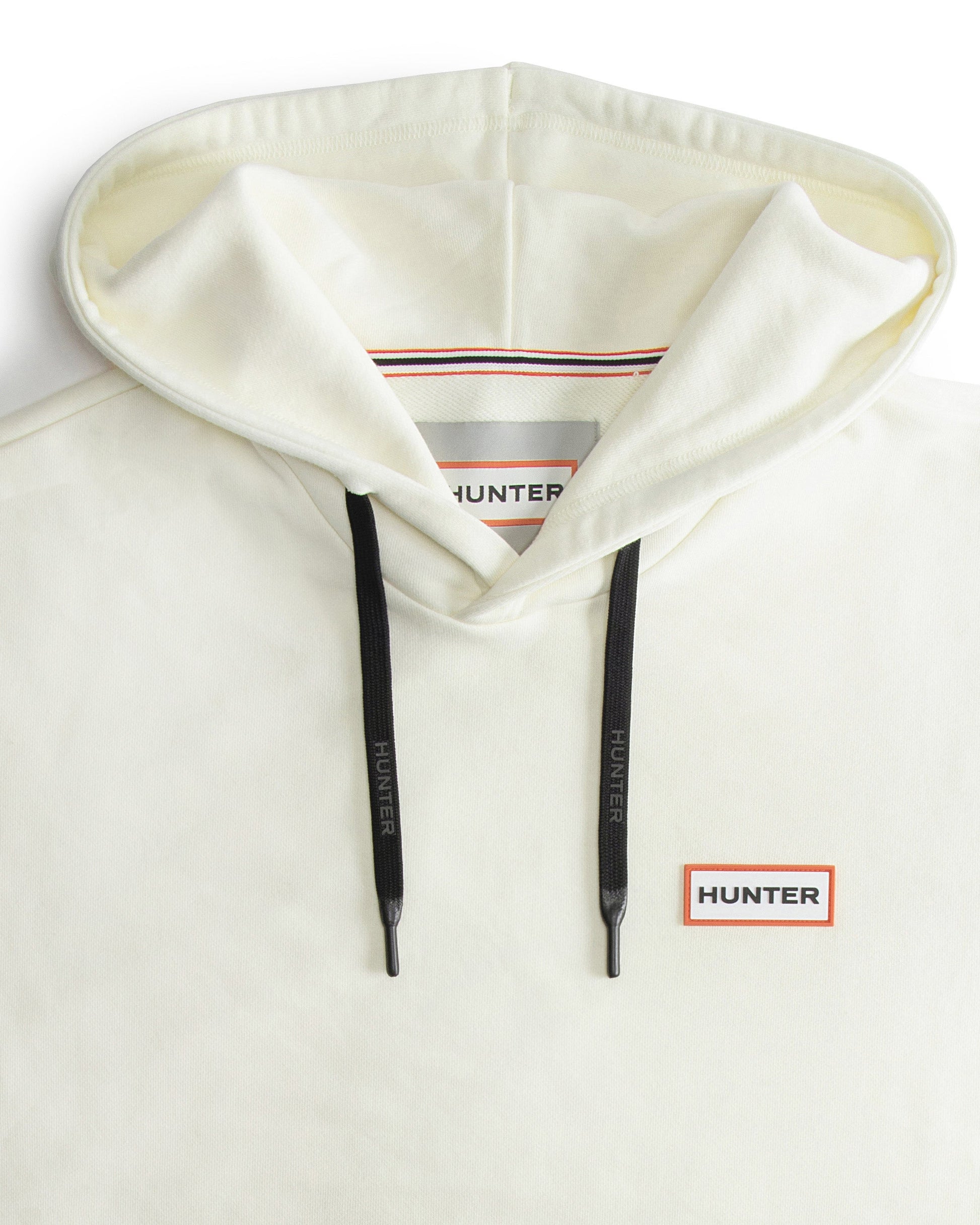 暖かい起毛ガーメントウォッシュドジャージーを使用したユニセックスプレイロゴフーディは1枚でも重ね着でも、様々なシーンで着られる完璧な1着です。着用感はレギュラーフィットで、前面にカンガルーポケットが施され、首元はカジュアルなラウンドネックになっています。さらに、縫い目にはハンターのラベルがあしらわれています。GOTS認証のオーガニックコットンとリサイクルポリエステルの混紡素材を使用し、フロントにハンターロゴのグラフィックプリントとクラシックなレッドのボックスロゴ入り。
