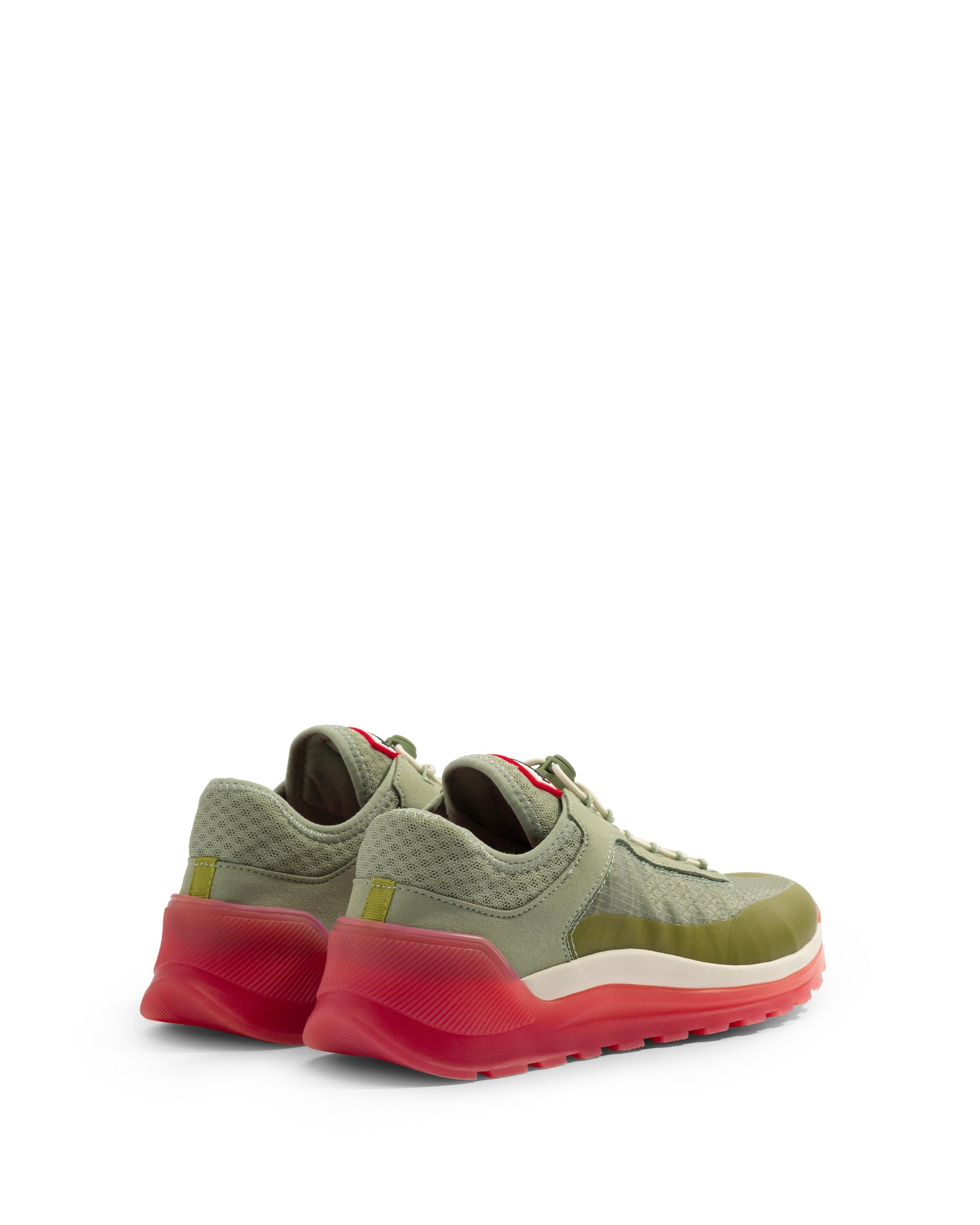 カジュアルなシティトレーナーにスポーツテイストをプラスしたハンターのトラベルトレーナーは、柔らかくで通気性に優れた100%リサイクルナイロンとメッシュの2層構造。軽量で衝撃吸収性に優れたリサイクルEVAミッドソールとリサイクルオーソライトの中敷きが優れた快適性と柔軟な履き心地を実現し、耐久性に優れたFSC®認証ラバーアウトソールがあらゆる路面に対応するグリップ力を発揮します。超軽量のTPUフォクシングラインが、雨からの保護をさらに強化します。