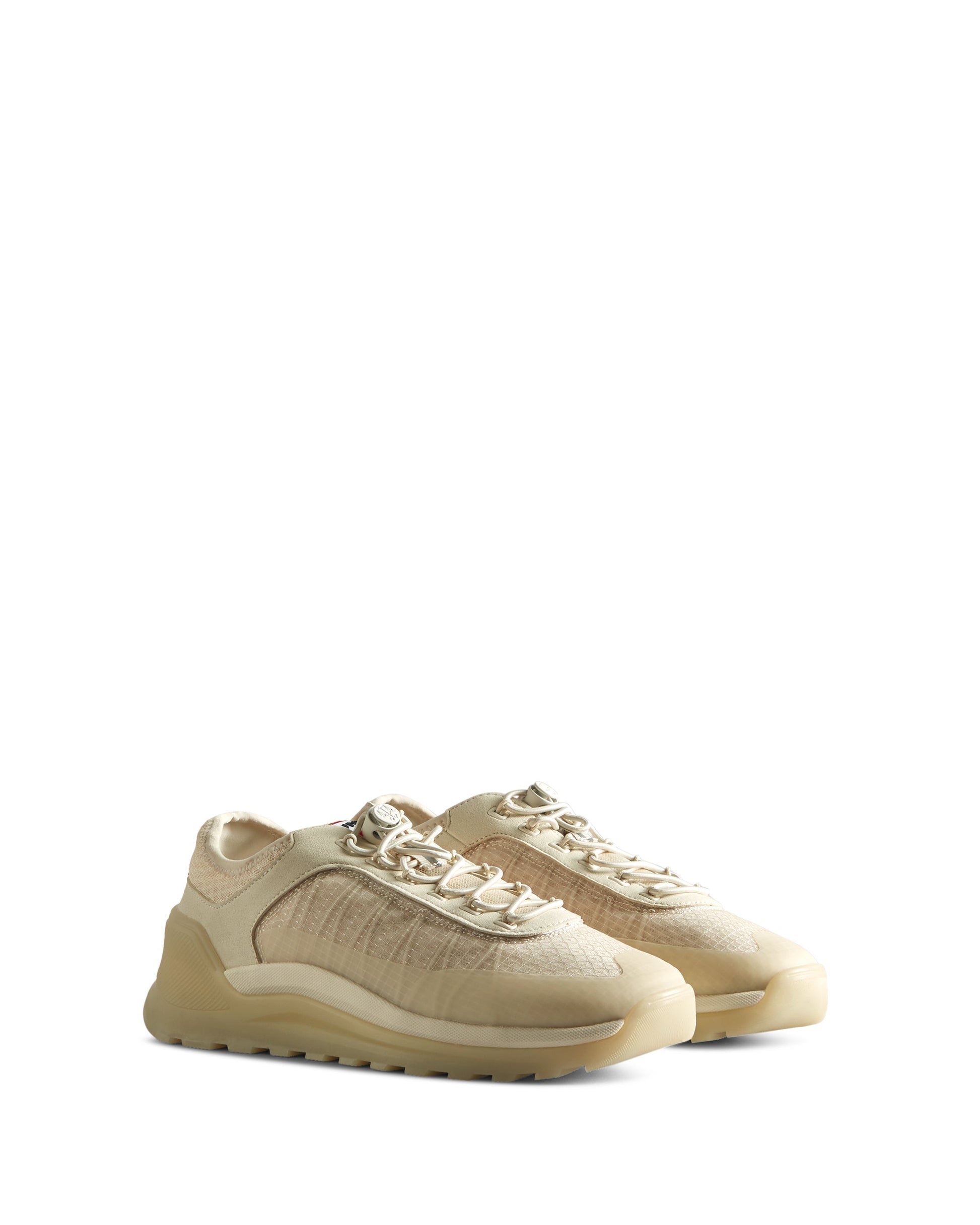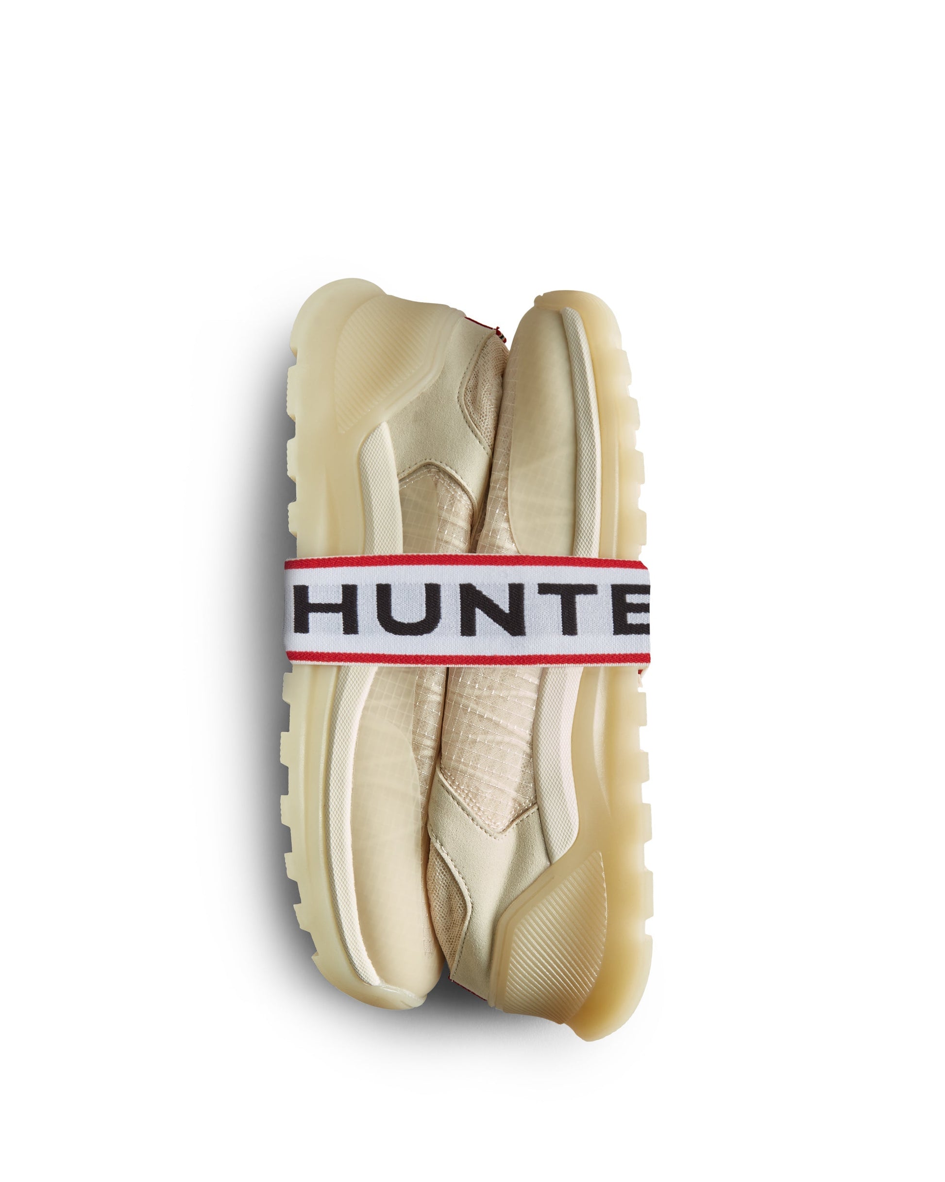 カジュアルなシティトレーナーにスポーツテイストをプラスしたハンターのトラベルトレーナーは、柔らかくで通気性に優れた100%リサイクルナイロンとメッシュの2層構造。軽量で衝撃吸収性に優れたリサイクルEVAミッドソールとリサイクルオーソライトの中敷きが優れた快適性と柔軟な履き心地を実現し、耐久性に優れたFSC®認証ラバーアウトソールがあらゆる路面に対応するグリップ力を発揮します。超軽量のTPUフォクシングラインが、雨からの保護をさらに強化します。