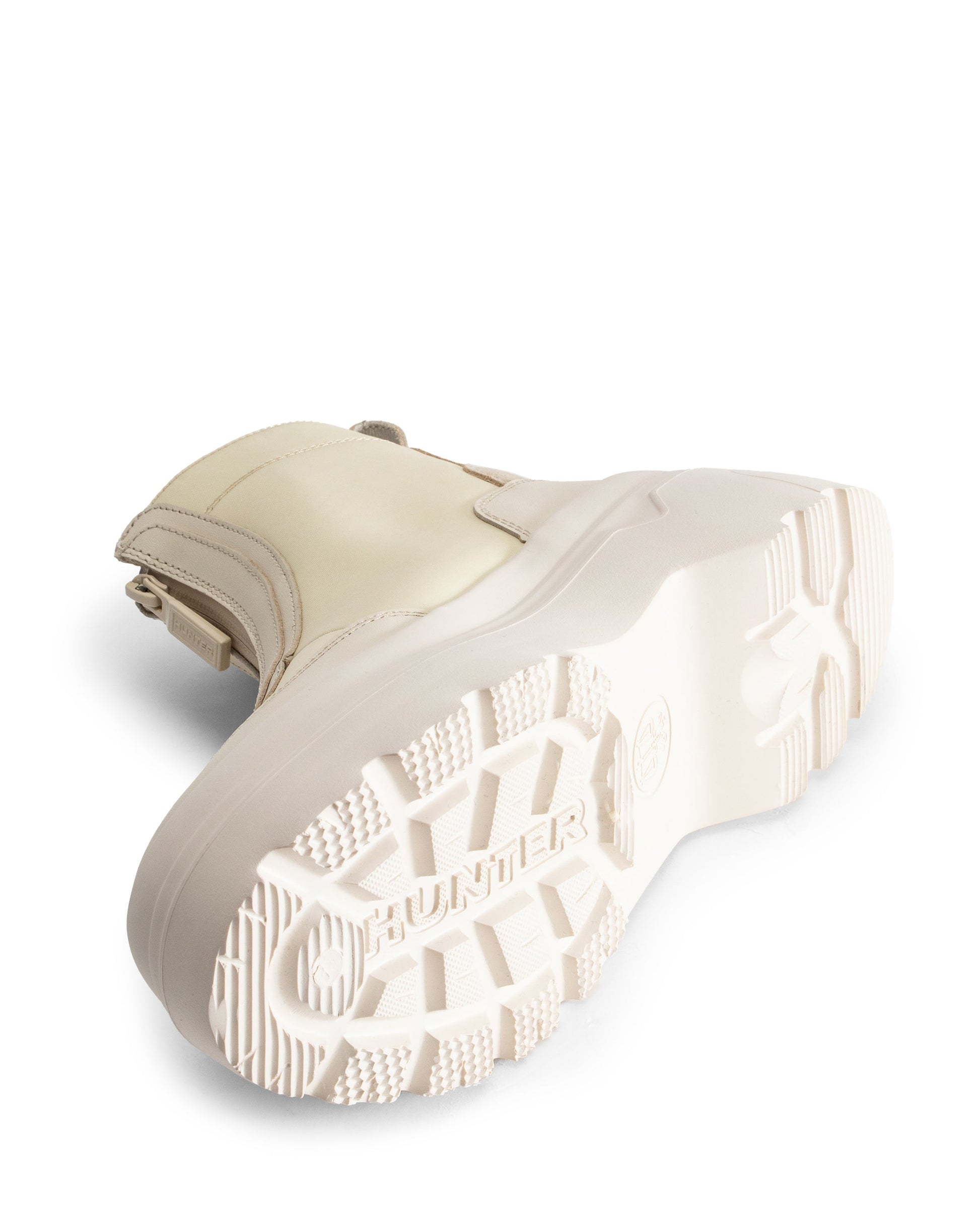 ハンターの1年を通して履ける新しいシルエット、エクスプローラーアンクルZIPフラットフォームブーツは、アッパーに耐水性のリサイクルナイロンとレザーを使用しています。リサイクルEVAを使用したアウトソール部分により超軽量化を実現し、止水加工ジッパーと内側にハイドロガードを使用した防水加工、テーピングにより高い防水性を確保しています。着脱が簡単で、ヒールにエンボス加工の同色ロゴ入り。