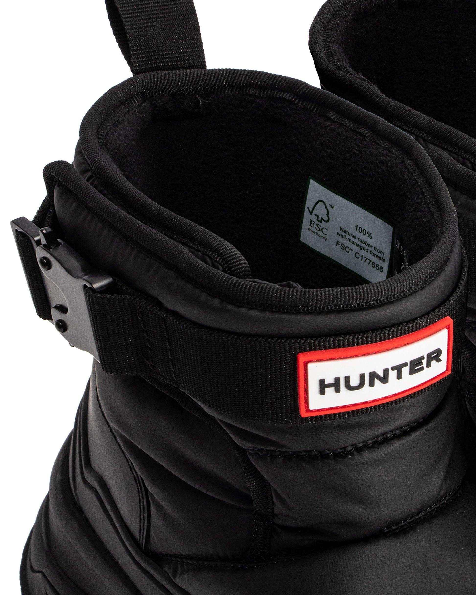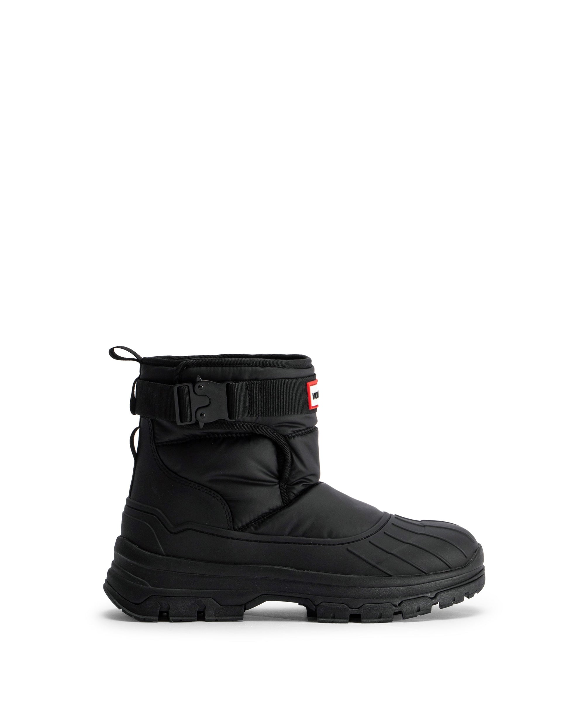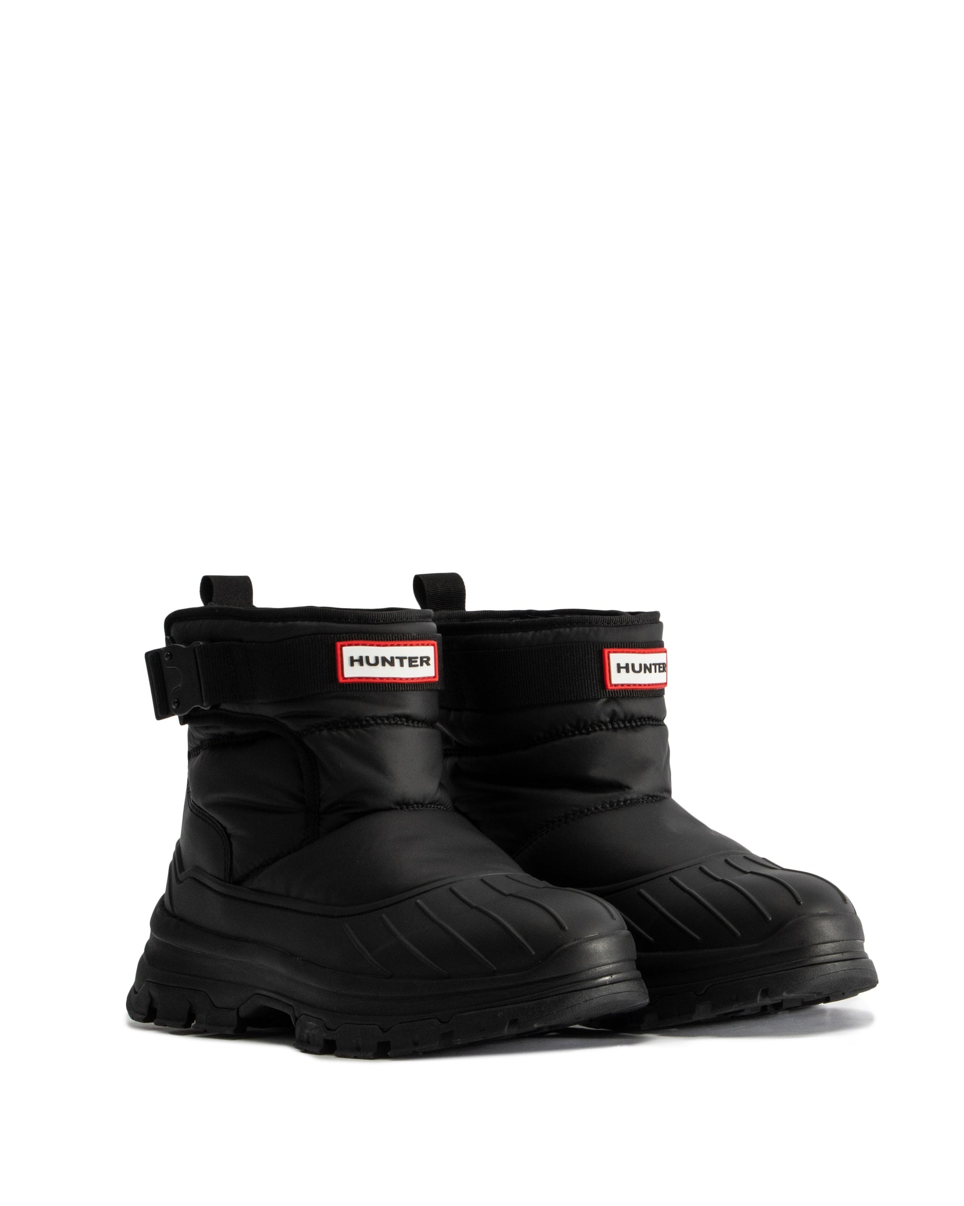 ハンターのスノーブーツシリーズに新しく加わったスタイリッシュなアイテム、イントレピッドショートバックルスノーブーツは新開発のチャンキーラバーアウトソールとTPUシェルを採用。足首をカバーできるハイカット丈のアッパーは、あらゆる天候から足を保護し泥除けとしての機能も備えています。マットブラックのワンタッチバックル、マジックテープの留め具、着脱をより簡単にする幅の広いマチが特徴です。リサイクルフリースを使用した裏地と内側にハイドロガードを使用した防水加工で、暖かくドライな履き心地をキープする手作りのブーツです。あらゆる地形に対応するアウトソールには耐久性に優れたFSC®認証ラバーを使用し、TPUヴァンプ、クッション性に優れたEVAミッドソール、OrthoLite®立体的なインソールを組み合わせることで、軽量なシルエットと保護性、快適性を実現。このブーツは100%防水で、-30℃(-22°F)まで着用可能です。