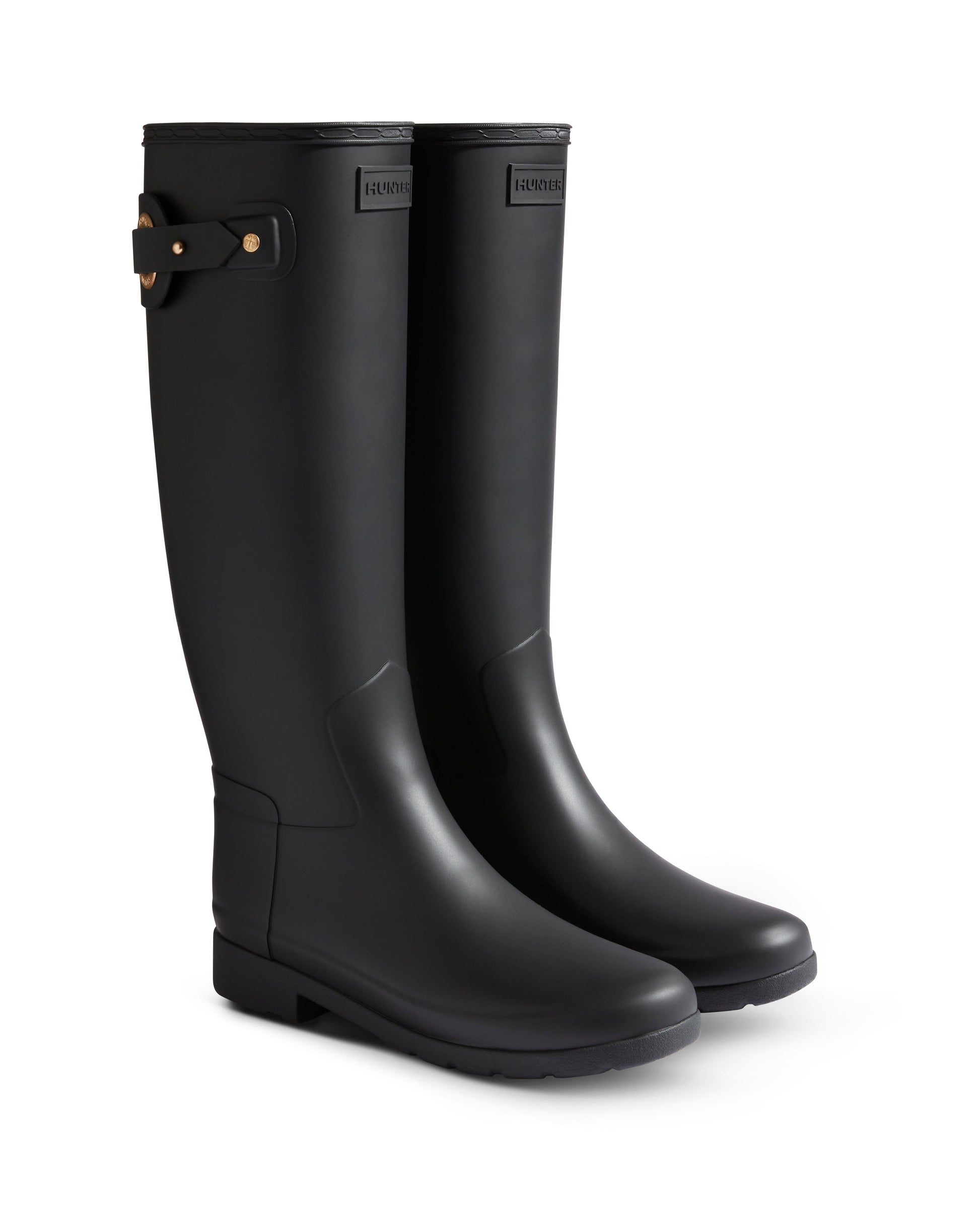このハンターリファインドトールブーツは、シックなマットゴールドのオルタネートアイレットバックルデザインが特徴。リファインドブーツは、スリムなフィット感と成型アウトソールの流線型のデザインで、ラバー層を少なくすることで軽量さを感じるデザインになっています。このブーツは、Forest Stewardship Council®(森林管理協議会)の基準に従って独自に監査された森林から採取されたFSC®(森林管理協議会)認定の天然ゴムから作られており、100%防水で、100%リサイクルポリエステルの裏地を備えています。