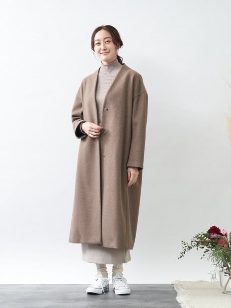 シンプルなノーカラーデザインは、タートルネックやパーカーなどインナーも選ばず、ストール使いもお楽しみいただけます。