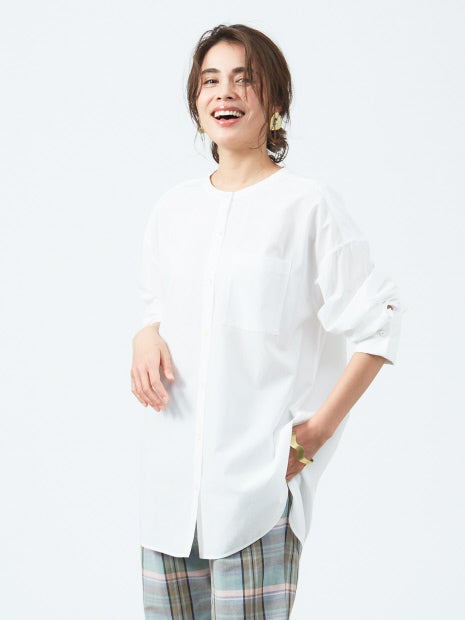 シンプルで少し着丈が長めのブラウスなので、ニットベストなどのレイヤードブラウスとしても重宝します。