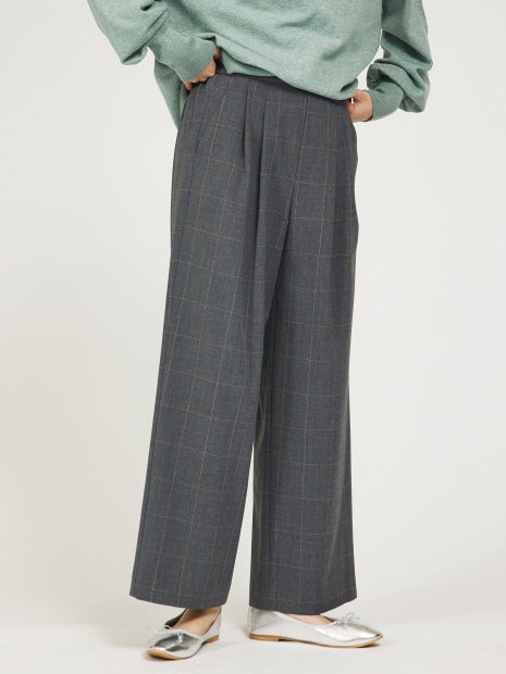 人気のタックワイドパンツに大人なチェック柄が新登場!きれいめからカジュアルまで幅広い着こなしに対応します。ストレートラインのシルエットが美しい、太すぎないワイドパンツです。タックインが綺麗に決まるフロントデザインで、ツータックで気になるお腹周りもスッキリして見えます。後ろウエストはゴム仕様なので履き心地も抜群。
