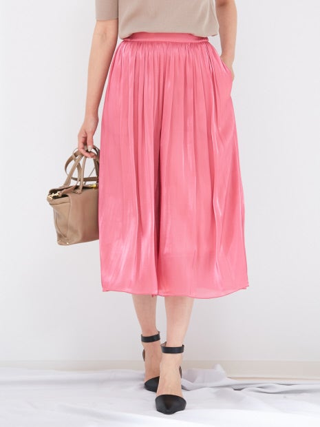 point1.サイドのプリーツのギャザー分量を少なくすることで下半身をすっきりpoint2.やわらかな素材で下半身をカバーし、軽さとしなやかさを演出point3.プリーツスカートの様に見えて、足さばきの良いスカウチョメタリックな光沢と裾の透けが今季らしいスカーチョ。スカート感覚で履いて頂けるフレアシルエットと、エアリーで揺れる素材が女性らしさを演出してくれます。足元はフラットなパンプスで抜け感をプラスするのがおすすめ。