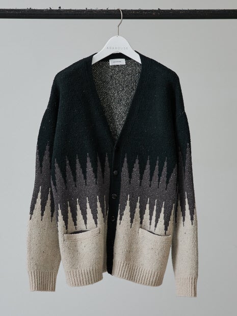 【素材】フェザーのような形状のオーガニックコットンを使用。柄の中心はソモウを使用し、肉感のある編地に仕立てています。【デザイン】レトロなジグザグ柄が映えるアイテム。肉厚な生地なのでアウターとしても重宝します。カラートーンを抑えめにしてマッチさせているので、落ち着いた雰囲気でお召いただけます。【コーディネート】1枚着はもちろん、アウターの中に差し込んでもポイントになります。カジュアルなカーゴパンツやデニム、ワイドパンツ等でカジュアルに着こなして。