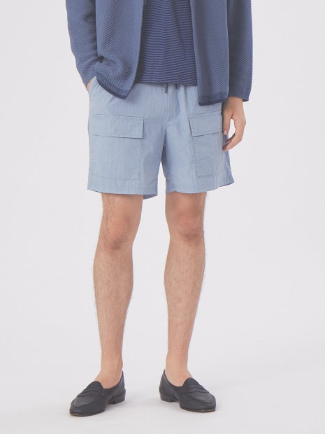 【デザイン】コンパクトなデザインのカーゴ型ショーツ。前面に配備されたフラップポケットがちょうどよいアクセントに。ウエスト部は紐がついているのでベルトレスでお使いいただけます。タウンユースにも、リゾートにもおすすめのショーツです。【素材】シャリ感のあるコットン&ナイロンで肌へ張り付きにくい素材。また、とても軽量な生地なのでストレス少なく穿いていただけます。草木染めをしているので、色がべったりとした印象にならず、涼しげな風合いです。【草木染め】草木染めは、合成染料を用いた染色に対し、「天然染料」を用いた染色のこと。若干むら感があり、優しい色味になるのが特徴。