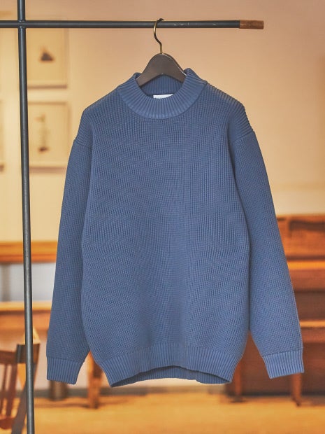 ミドルゲージ(7ゲージ)で編み込みながらも、ボリュームを生み出す畦編みにすることによりざっくりとしたボリュームのあるニットを使用。ポリエステル素材なので型崩れしにくく、キックバックも効いているのでご自宅でのお取り扱いもしやすくデイリーウエアとして気兼ねなく着用いただけます。秋から春まで着用できる3シーズン着用可。