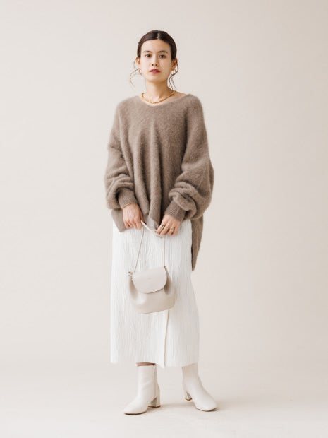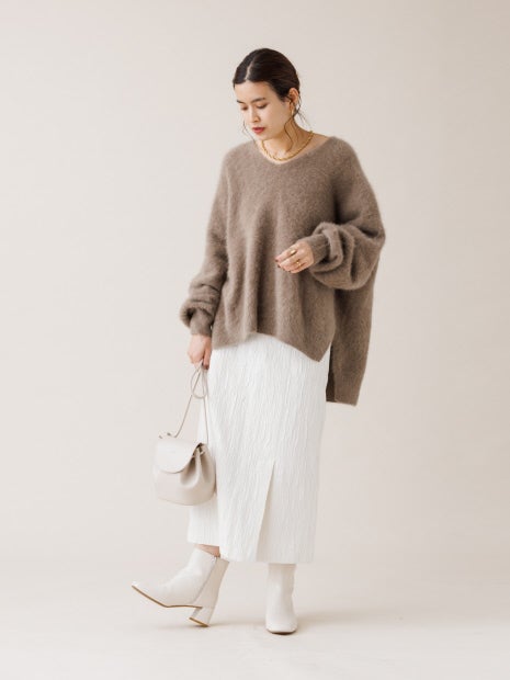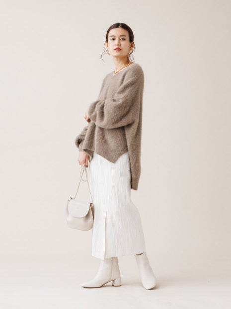 凹凸のあるシボ素材が冬人気の起毛系ニットと相性抜群。