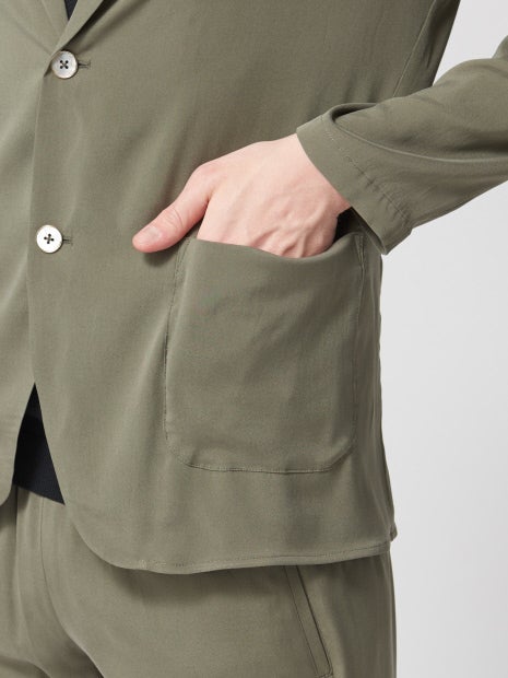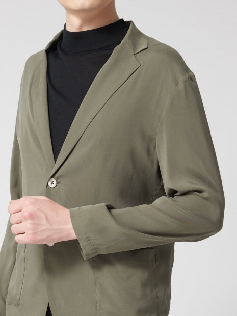 【デザイン】カーディガン感覚でさっと着こなすことのできるサマージャケット。抜群の伸縮性とシルクを使用した見た目にもマットな艶が他にはないラグジュアリーな一着に。【素材】シルクサテンに限界までサンドウォッシュをかけた、しなやかさとドレープ感が特徴の素材を使用。ケアも手洗いが出来るイージーケアなので気にせず着用する事ができます。【コーディネート】単品使いはもちろん、同素材のパンツと合わせたセットアップスタイルがお勧めです。