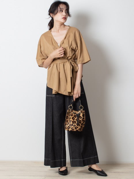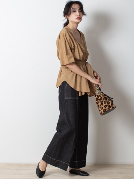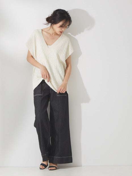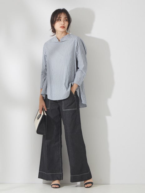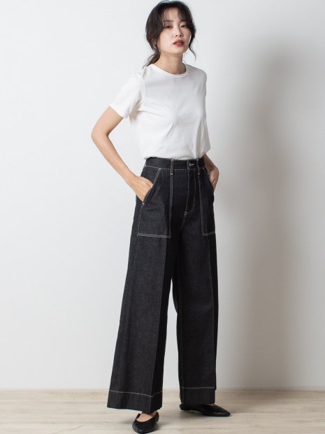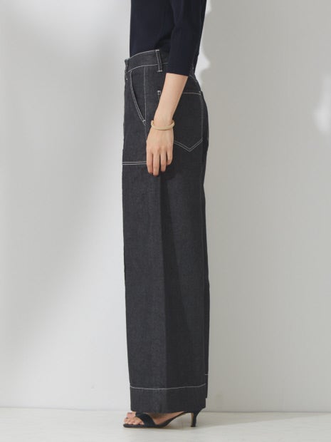 腰骨からまっすぐ伸びるワイドシルエットとポケットのステッチが、気になる腰回カバーします。