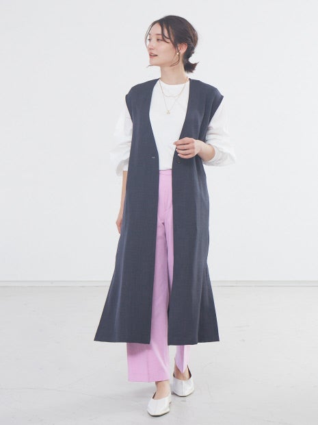 ロンTやカットソーに羽織るだけでコーデがワンランクアップするロングジレ。